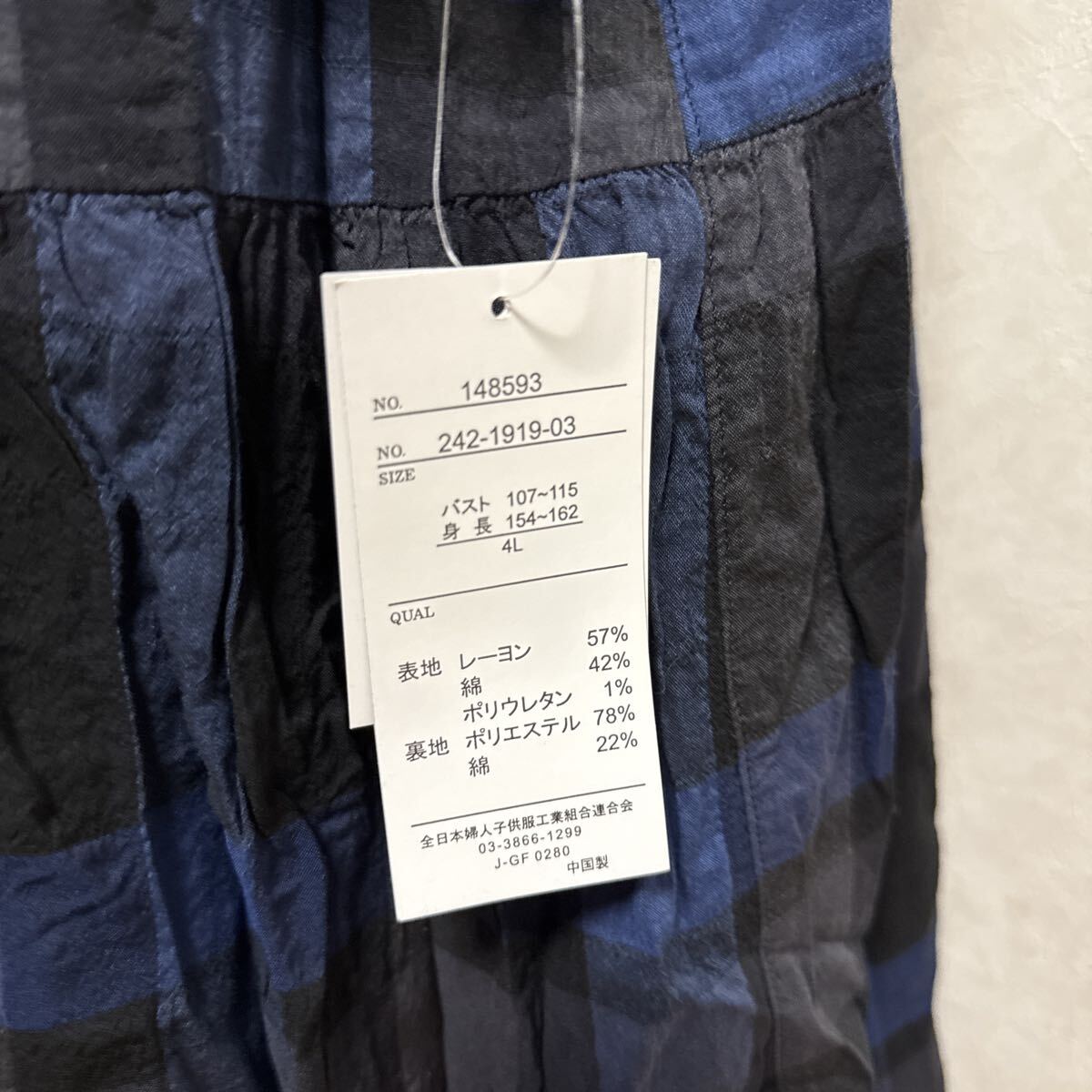KN3180 *4L 大きいサイズ シャーリングチェック素材、ティアードワンピースネイビー系