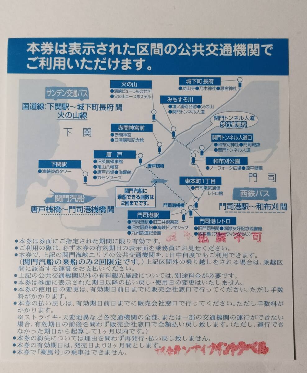 商品説明 | ★商品について 閲覧ありがとうございます。 ★ ★★ 関門周遊 一日パスポート/2025年12月31日までです。 下関・門司周辺の表示された区間のバスが 1日乗り放題、関門汽船が2回まで乗船できます。 |