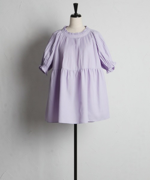 首と袖にあしらわれたギャザーデザインが着映えするブラウスで可愛い♪