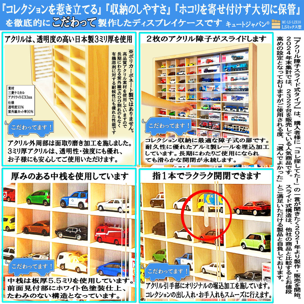 ミニカーが40台、ロングトミカが20台収納可、コレクションをより一層惹きたてるディスプレイケースです。