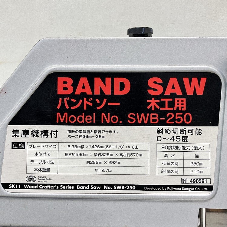 | 管理番号:1100000107533 メーカー:SK11/藤原産業 型番:SWB-250 規格・仕様: 【特長】 ・斜め切断可能(0~45度) ・市販の集塵機と接続できます。 【仕様】 ・90度切断能力(最大): 75mmの時 250mm 94mmの時 210mm ・ブレードサイズ:幅6.35mm×1426mm(56-1/8")×6山 ・テーブル寸法:約292×292mm ・本体寸法:長さ約590×幅約325×高さ約570mm ・重量:約12.7kg 詳細備考: 替刃は新品に交換後、動作確認のため5回画像の木材を切断しました。 【仕様】 ・90度切断能力(最大): 75mmの時 250mm 94mmの時 210mm ・ブレードサイズ:幅6.35mm×1426mm(56-1/8")×6山 ・テーブル寸法:約292×292mm ・本体寸法:長さ約590×幅約325×高さ約570mm ・重量:約12.7kg 商品は写真に写っているもので全てです。(※背景などにある無関係の物は含まず) 他に付属品はありません。 ご質問はお気軽にどうぞ。分かる範囲でお答えします!! ※上記は型番などから調べたデータを抜粋したものです。 |
