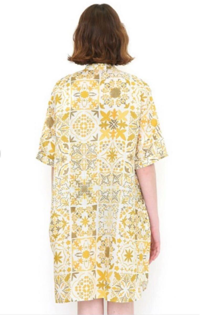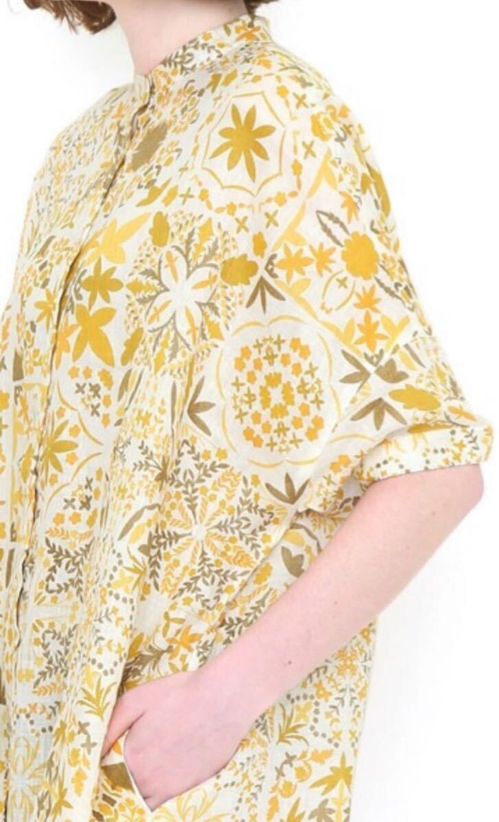 麻100%の布帛素材を使用したゆったりしたシャツワンピース。ボタンを開けて羽織としても使用できる五分袖の脇ポケット付き麻シャツです。麻は綿の4倍の吸水性があり通気性もよく肌に張り付きません。夏を快適に過ごせるアイテムです。幾何学模様や植物など、さまざまな柄で構成したタイル装飾風のデザイン。美しい色彩と、オリエンタルなテイストが魅力です。