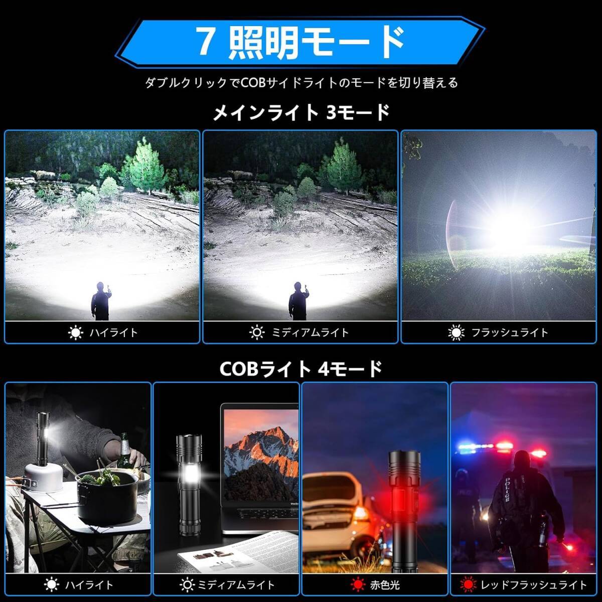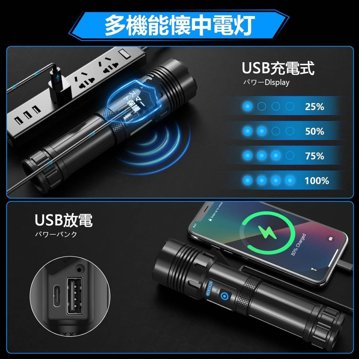 懐中電灯 フラッシュライト led 強力 軍用 最強 充電式 ハンディライト 30000ルーメン 超高輝度 IP67防水 7モード調光 ズーム AF447
