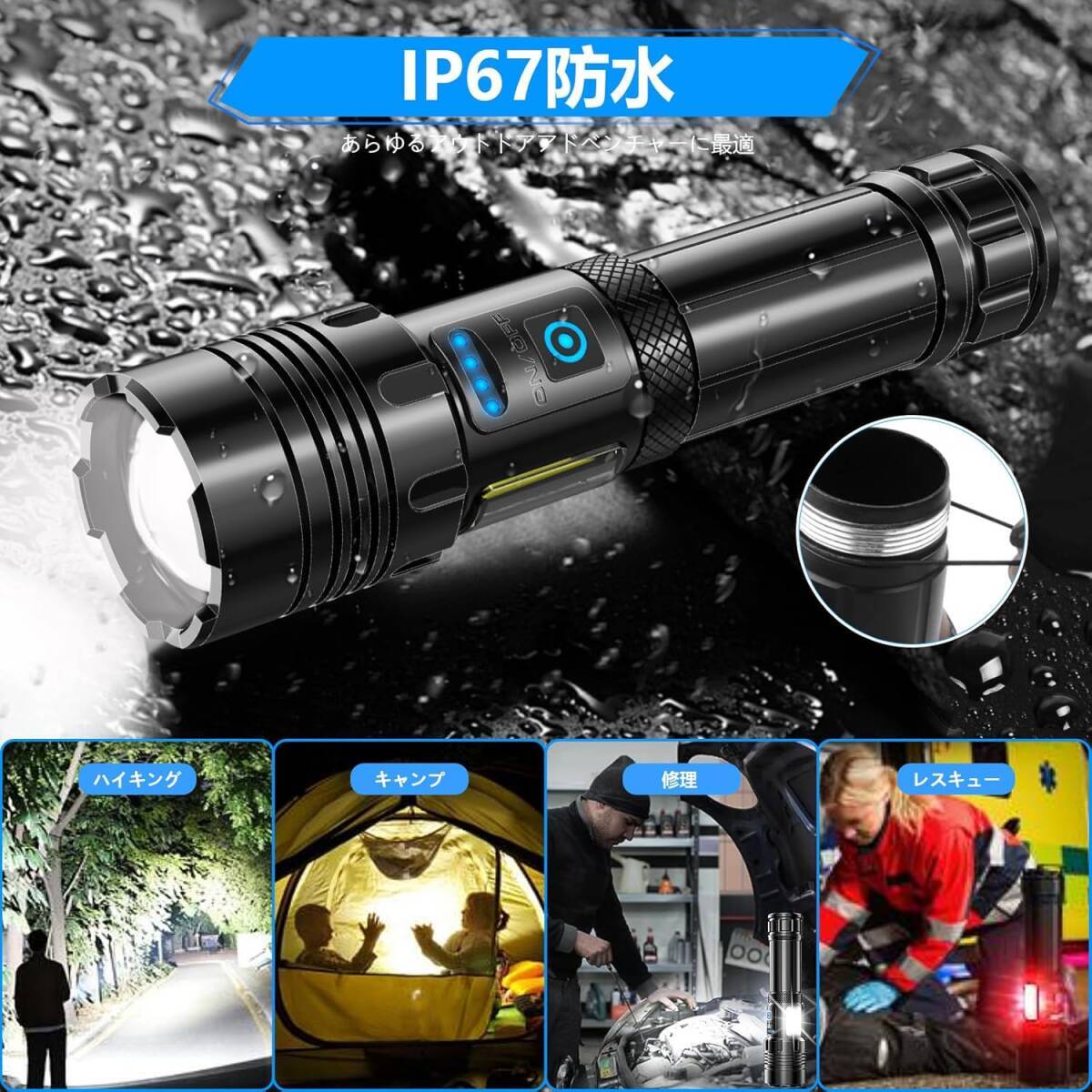 30000ルーメンの驚異的な明るさ:最新のXHP70.2LEDチップにより、通常のLED懐中電灯の10倍の明るさを実現。USB-C充電対応:過充電保護機能を備えており、充電が完了すると自動で停止します。リアルタイム電量表示:バッテリーの動作状態を正確に確認できるスマートLEDディスプレイ搭載。7つの照明モード:高、中、ストロボ、COB側の高、中、赤色光、赤色ストロボの7つのモードを切り替えて使用できます。ズーム機能:片手で広いビームと狭いビームを切り替え可能。ワイドビーム照明は広い視野を提供し、ナロービーム照明は最大500メートルの遠距離を照らします。IP67防水・耐衝撃性:航空宇宙グレードのアルミニウム合金製で、3メートルの落下にも耐え、雨やほこりからも保護します。