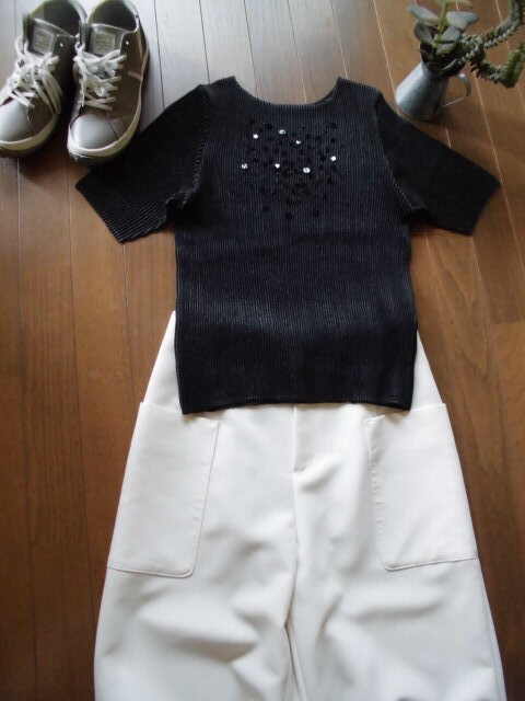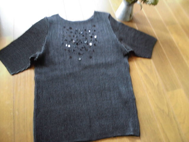 新品 表記44 (株)創美 表スパンコールビジューデザインプリーツカットソー