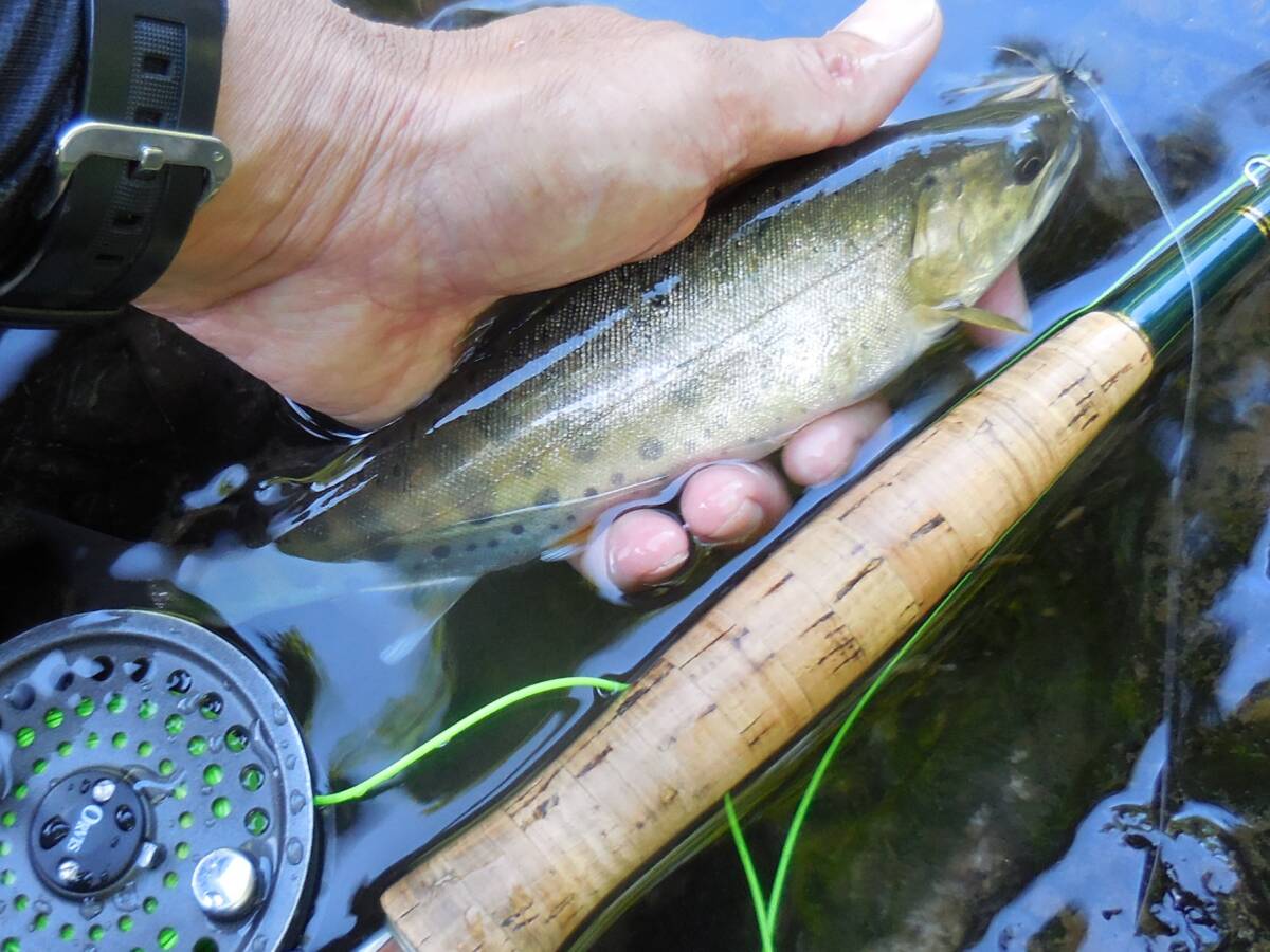 連日30℃を超える暑さの中、渓流も水位が低く水は温くかなり厳しい状況下での釣りとなりました。初めて入る区間で大物からの反応はありませんでしたが、40cm以下のニジマス、ヤマメ合わせて10匹ほど釣ることができました。