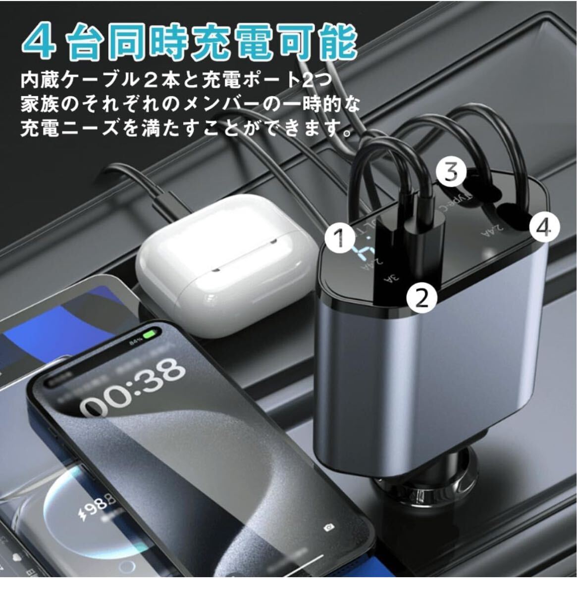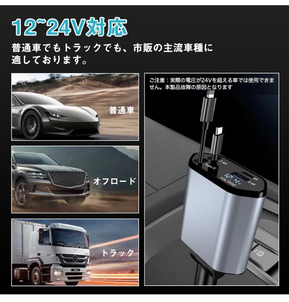 シガーソケット USB 車 充電器 カーチャージャー 巻き取り式 4 in 1 4台同時使用 ケーブル 2本 DC12/24V 車対応 多機種に対応