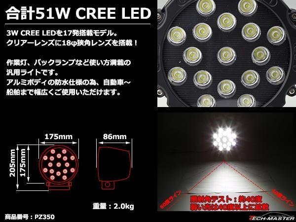 ■商品コード PZ350 ■商品タイトル 汎用51W 3W CREE LED×17発 18Φ狭角レンズ 作業灯 ■発光色 6000K ホワイト ■数量 1個 ■防水性能 保護等級:IP67 ※レンズ周りに水がたまる使用方法は使用不可 ■特徴 3W CREE LEDを17発搭載モデル。 クリアーレンズ+18Φ狭角レンズを搭載! 作業灯、バックランプなど使い方満載の汎用ライトです。 アルミボディの防水仕様の為、自動車?船舶まで幅広くご使用いただけます。 ■対応電圧 DC10?30V ■照射角 約40度 弱い光は40度以上に拡散 ■その他商品 作業灯(ワークライト) リレーハーネス LEDコントローラー ヒューズ |