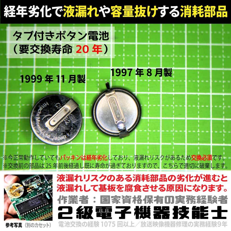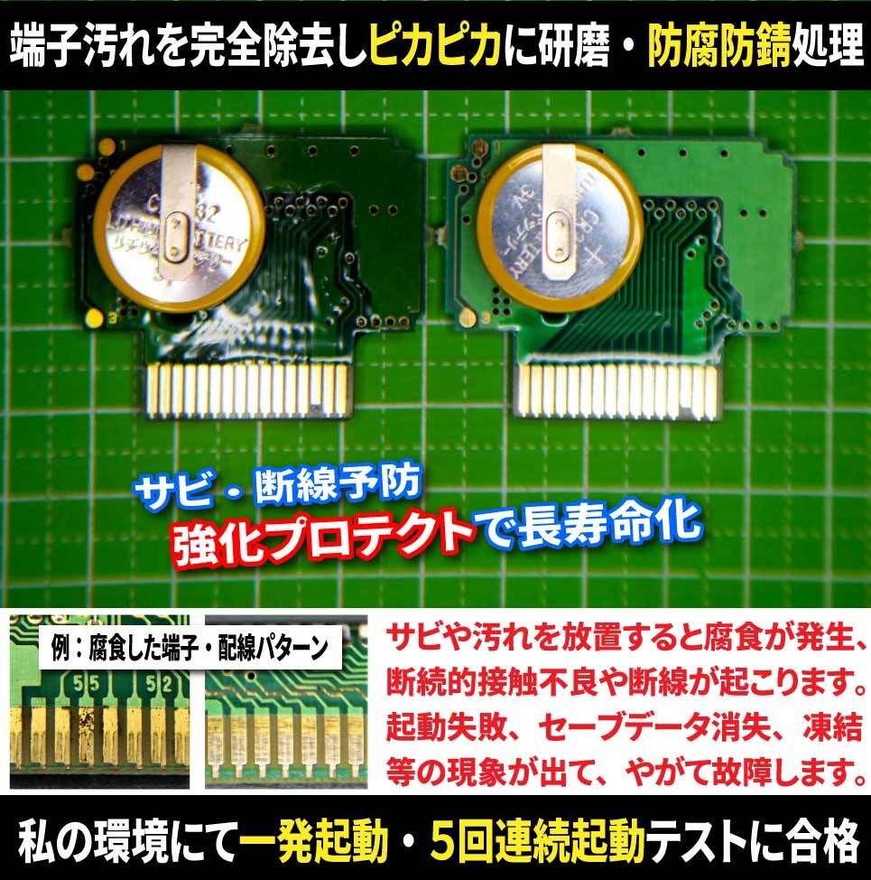 要交換寿命20年の電池電圧が規定値以下になると、記録が消えセーブもできなくなります。また液漏れにより基板を腐食させるリスクもあります。この商品は液漏れガード付き特殊電池を正しい工程・温度・加熱時間の半田溶接で交換しセーブ機能復活!寿命延長!劣化した端子を独自技法でピカピカに高温研磨することで一発起動から5回連続起動テストに合格しています。