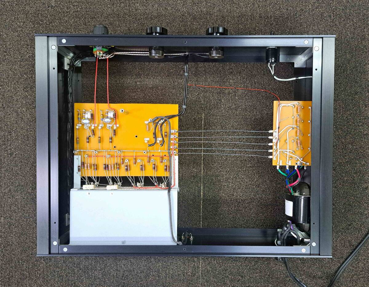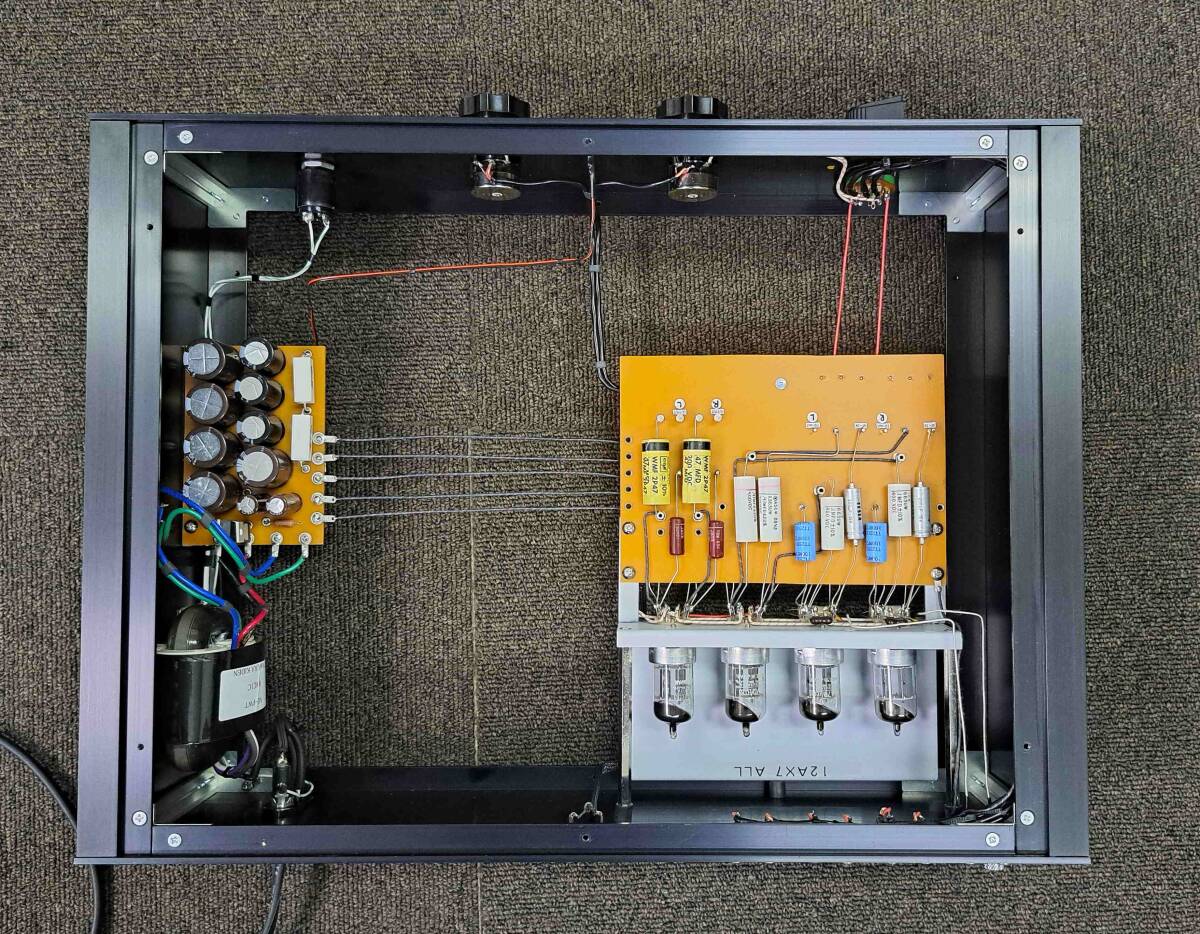 電源はノイズの少ないRコアトランスを使用、倍電圧回路構成で整流Diはシリコンカーバイトを使っています。真空管は松下製12AX7の中古球を4本使っています。私は松下が好みですが、お好みの球に交換して楽しむのも良いかと思います。