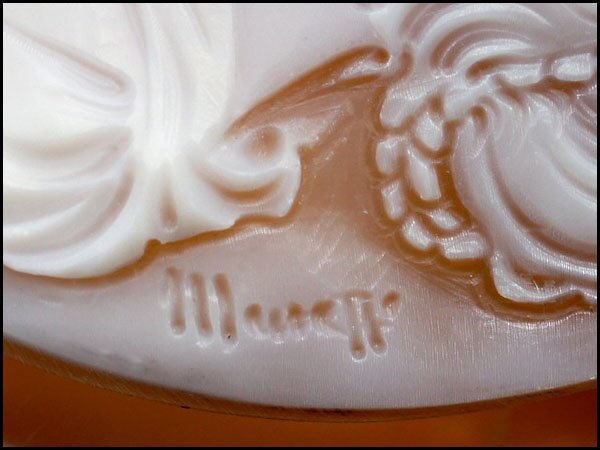 微笑ましい表情の貴婦人は、柔らかい髪の曲線や、艶やかな肌の質感など、精緻を極めた繊細な彫刻で演出された魅力的なシェルカメオルース作品です!
