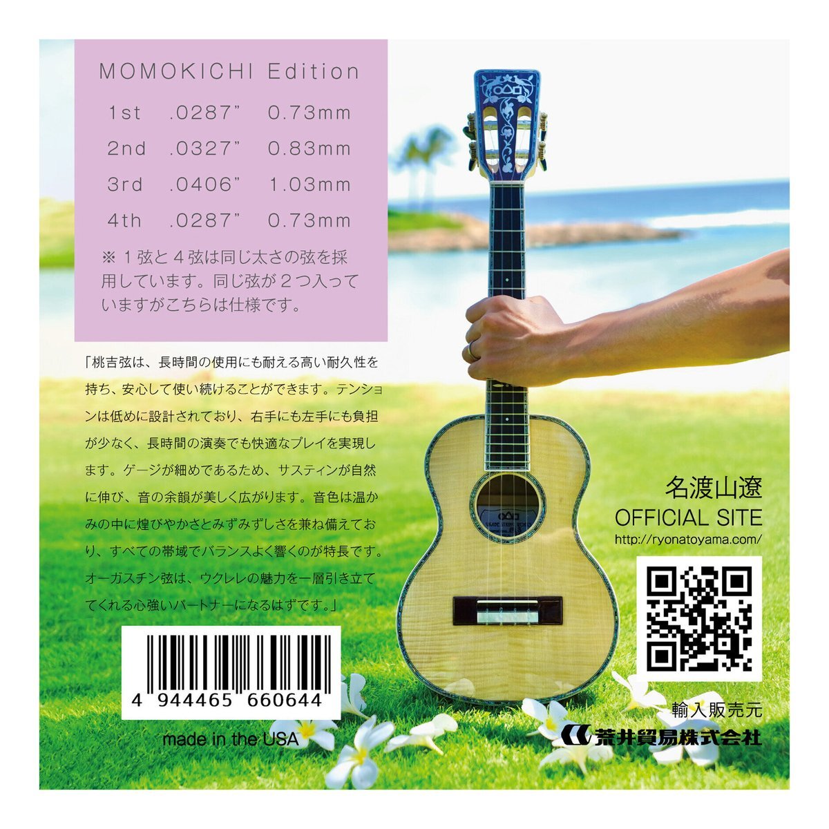 | 桃吉弦は、長時間の使用にも耐える高い耐久性を持ち、安心して使い続けることができます。 テンションは低めに設計されており、右手にも左手にも負担が少なく、長時間の演奏でも快適なプレイを実現します。ゲージが細めであるため、サスティンが自然に伸び、音の余韻が美しく広がります。 音色は温かみの中に煌びやかさとみずみずしさを兼ね備えており、すべての帯域でバランスよく響くのが特長です。 オーガスチン弦は、ウクレレの魅力を一層引き立ててくれる心強いパートナーになるはずです。 1st:.0287”(0.73mm) 2nd:.0327”(0.83mm) 3rd:.0406”(1.03mm) 4th:.0287”(0.73mm) ※1弦と4弦は同じ弦が採用されています。 |