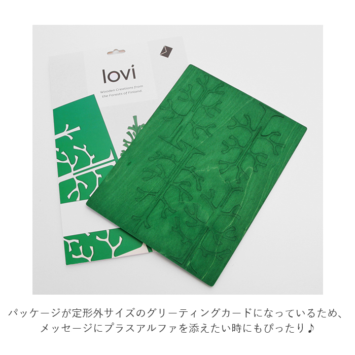 | 商品説明 | ・Lovi(ロヴィ)は国土の80%が森と湖の大自然に囲まれた森の国フィンランドのブランド。 ・メイド・イン・フィンランドの最高級の白樺のプライウッドで作られているロヴィの製品は、切り込みに沿って切り取り、差し込むように組み立てると、北欧らしい立体的なデザインのオーナメントやオブジェに! ・ロヴィのミニサイズのクリスマスツリー(Momi-no-ki)は、白樺のナチュラルな雰囲気を演出する手のひらサイズの可愛いオーナメント。 ・北欧フィンランドでは、「幸せの贈り物」と呼ばれているバーチ材(白樺・しらかば)のアイテム。バーチは北欧の国では、幸運をもたらす縁起の良い木として喜ばれる素材。 ・繊細ながらも立派なツリーは、シンプルでおしゃれなインテリアのアクセントに。一枚一枚、丁寧に組み立てて自分の手で作りあげる楽しさが味わえる! ・地元フィンランドの人々とともに、1年に5000本もの木を植える植林活動をしているロヴィ。普段から森や水に接し、自然を大切にする北欧の人々ならではの社会貢献活動に、ロヴィの商品を購入することで、わたしたちもその一端を担うことができる。 ・パッケージが定形外サイズのグリーティングカードになっているため、メッセージにプラスアルファを添えたい時にもぴったり♪ |