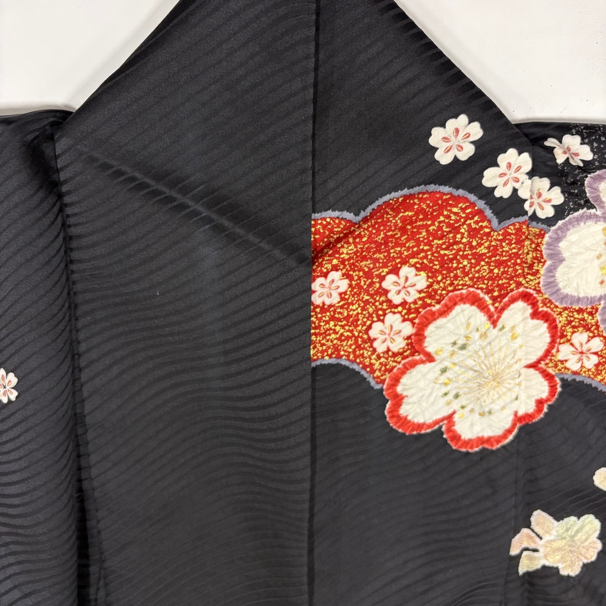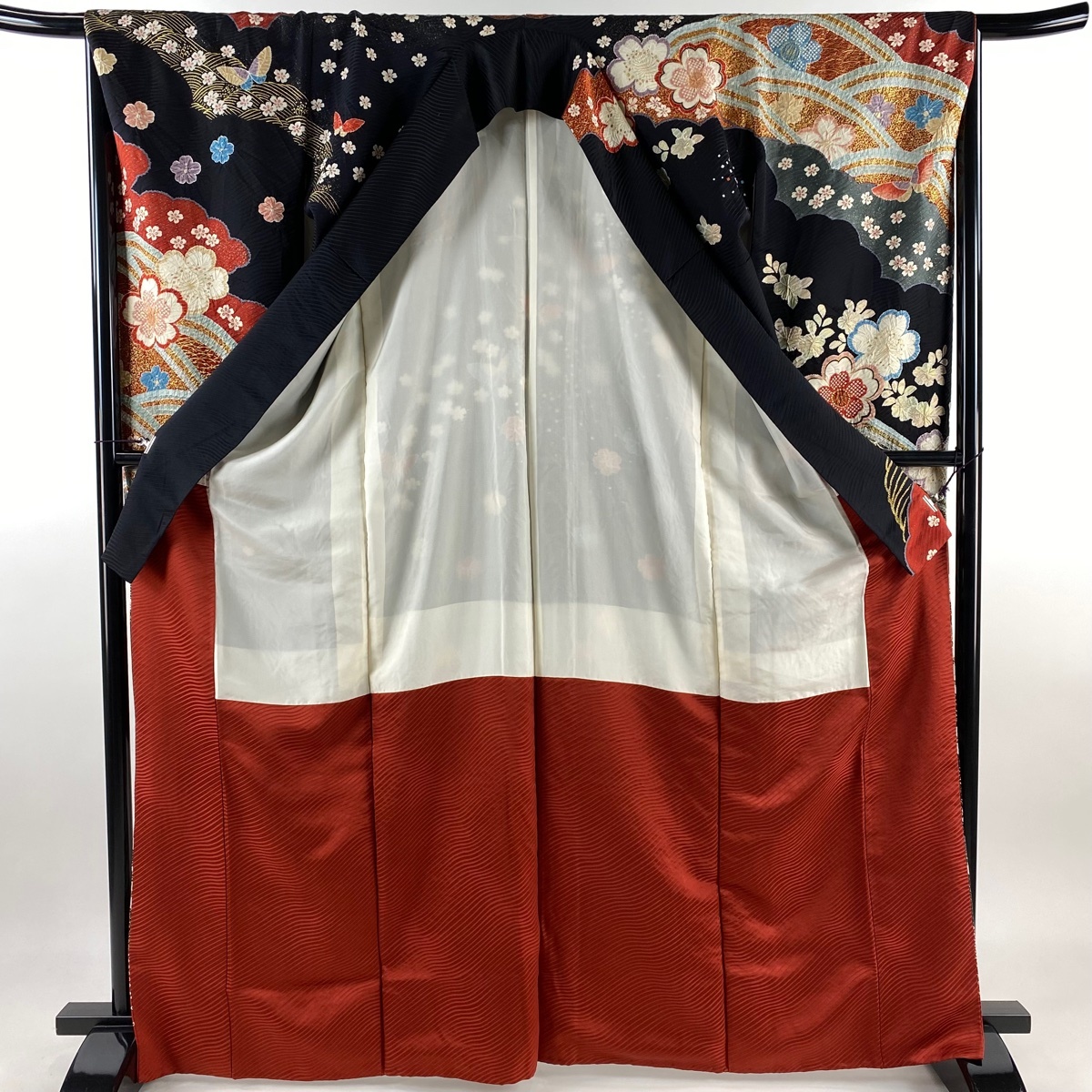 | 振袖 名品 落款 桜 波 金彩 絞り 黒 袷 身丈167.5 裄丈66.5 M 正絹 【中古】 |