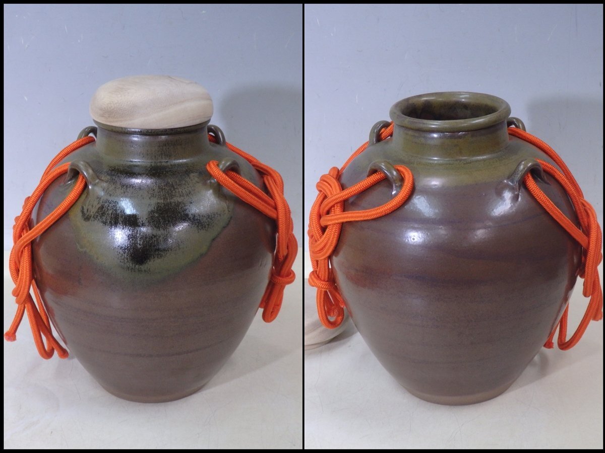 ●状態良好!信水窯【丹波 飾壷 共箱】網・紐3本・口覆・口紐付き 直径22cm 高さ29cm 茶道具 茶器