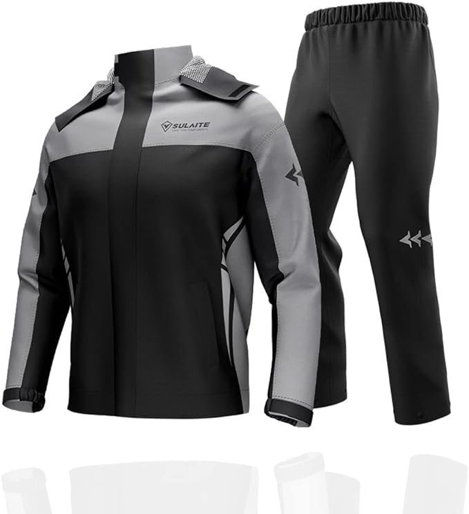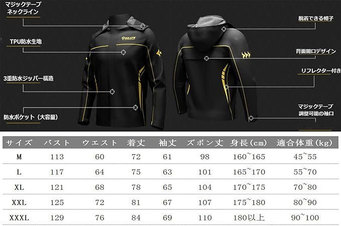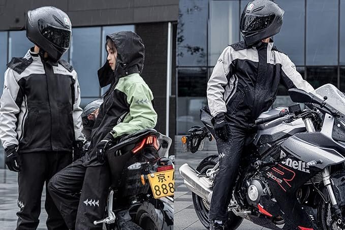 【便利な構造】脱着できる帽子、マジックテープで上着の大きめ&アジャスターが調整可能、リフレクターの設計、より安心。スタイリッシュのバイクウェア。