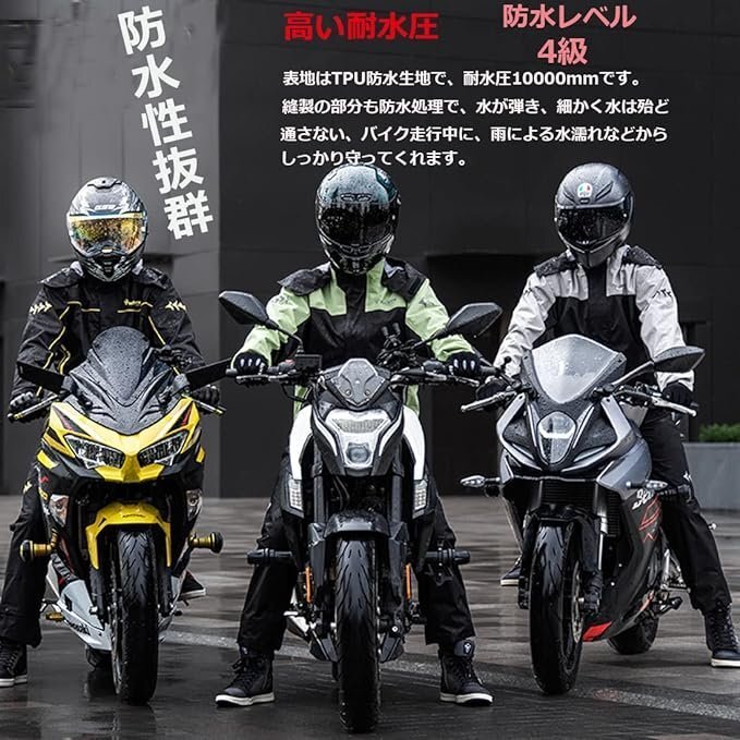 【防水性抜群】表地は防水生地で、耐水圧は10000mmです。縫製の部分も防水処理で、水が弾き、細かく水は殆ど通さない!バイク走行中に、雨による水濡れなどからしっかり守ってくれるレインコートです。