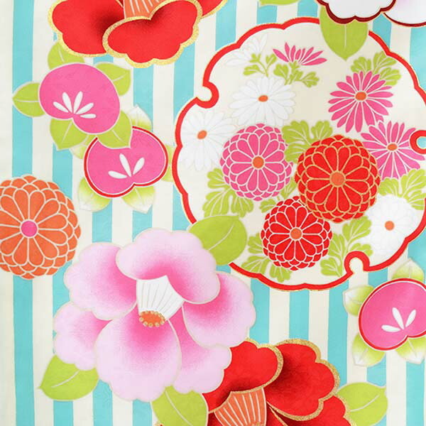 【色柄】水色とクリーム色で縦縞柄を描き、大きな椿と雪輪に菊の花を表現したお着物です。キリリとした縦縞に可憐な文様のお振袖です。