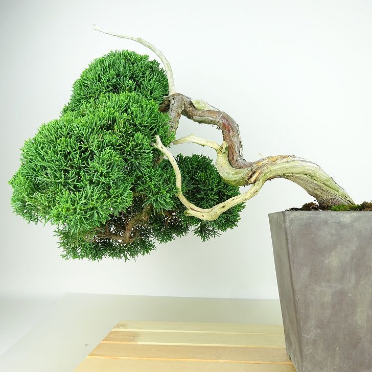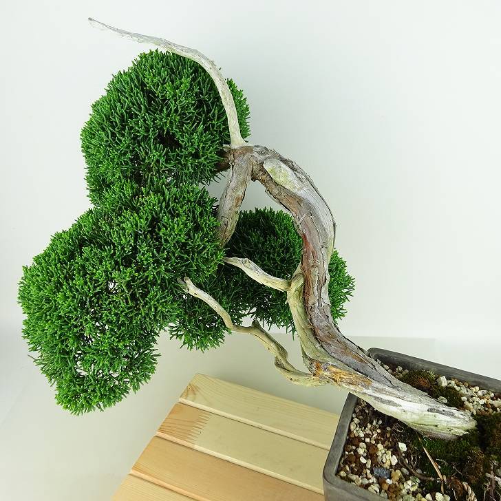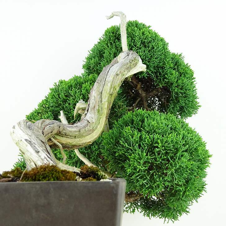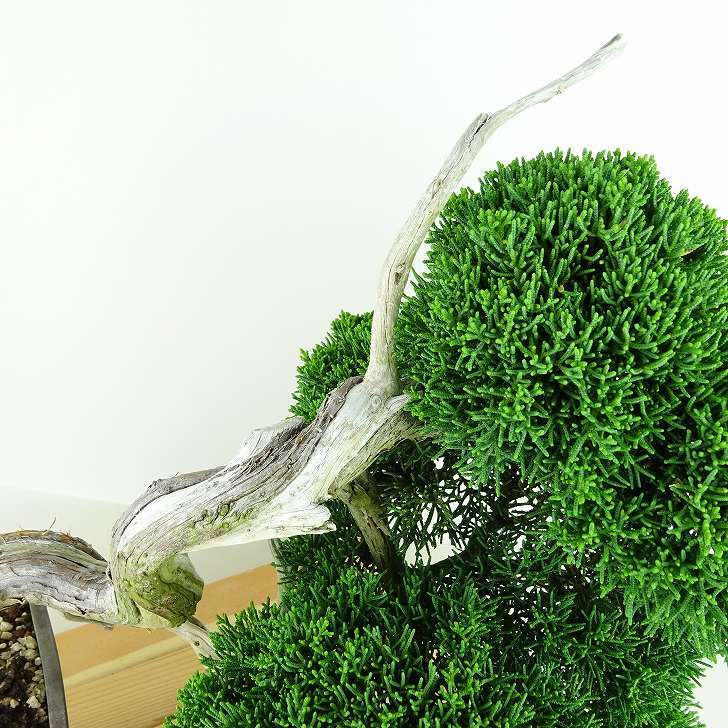 ■植物ですので撮影時期や季節によって剪定などの手入れにより写真から変化がございます。撮影日をご確認のうえ、ご注文ください。 ■年に一度、冬頃にジン・シャリのお手入れをおこなっています。薬品の関係で黄色く変色しているようにみえる場合がありますが徐々に薄れていくので問題はありません。 【真柏盆栽】 シンパクの1番の特徴と言えば、短く締った紐状の葉と、わずかな水吸いでも生き抜くことができる強靱な幹枝です。自然界では積雪や強風などで押しつぶされ木部が露出し、朽ちて白骨化したものが見られます。枝の一部が白骨化したものを神(ジン)、幹の場合は舎利(シャリ)といいます。 |