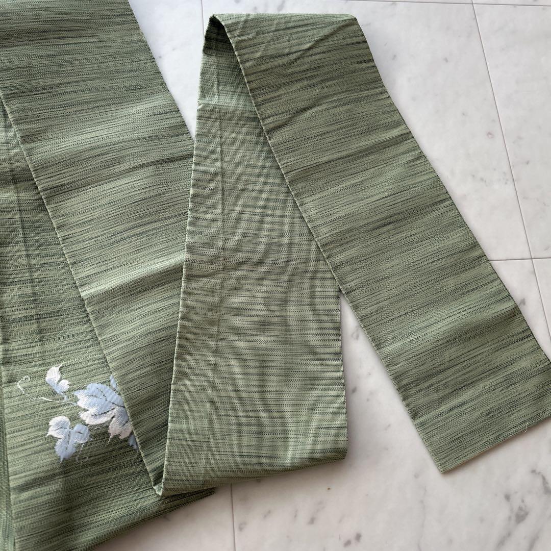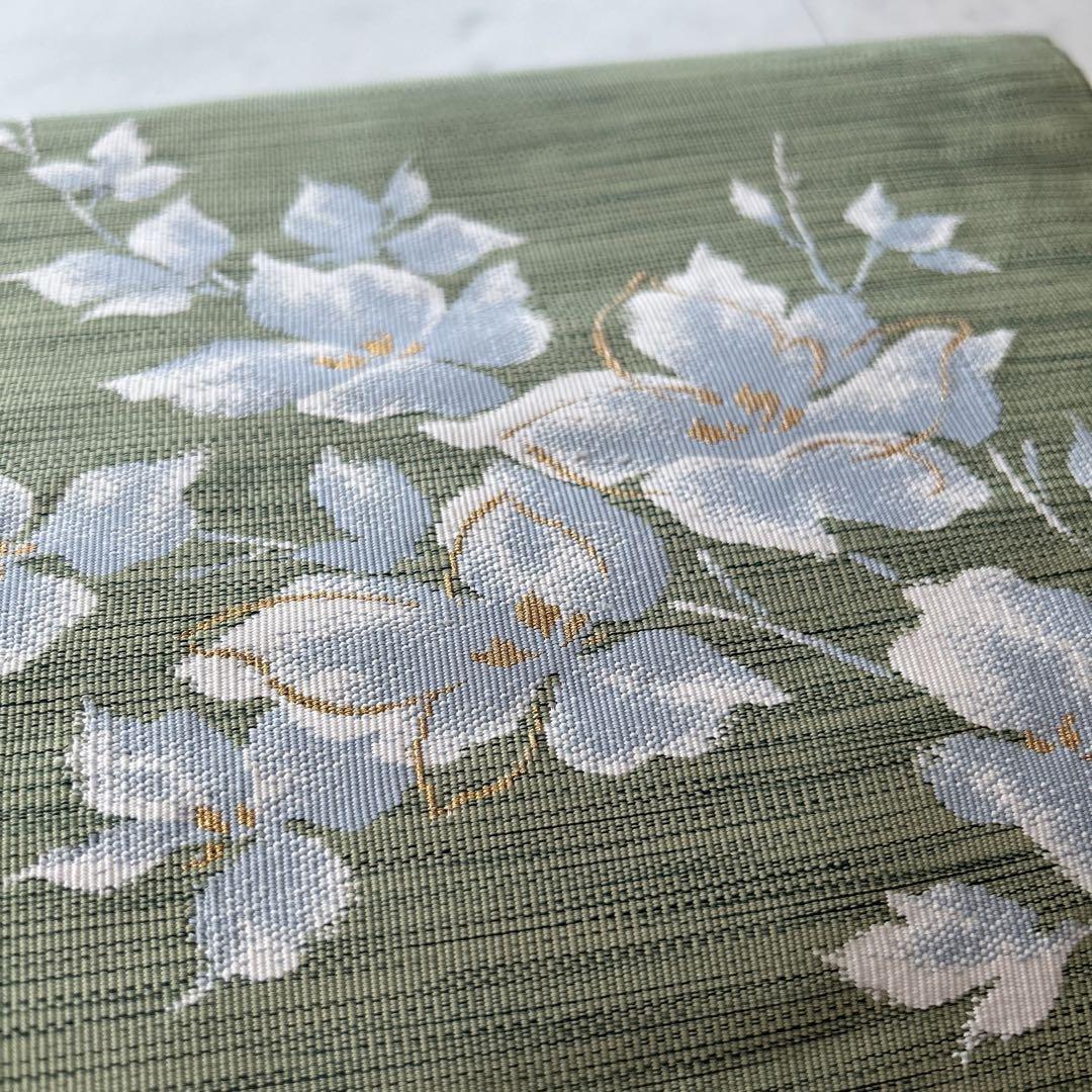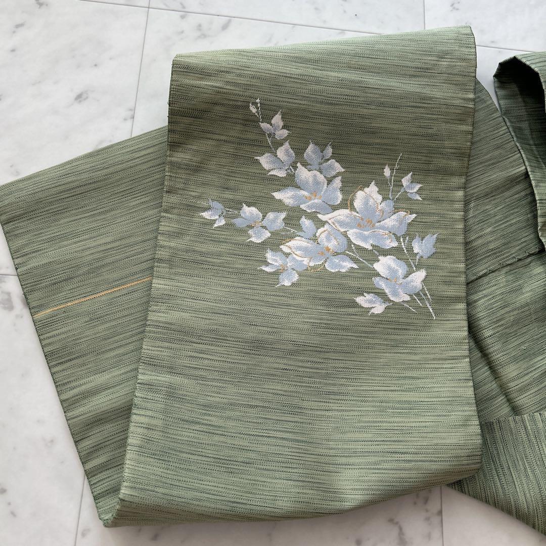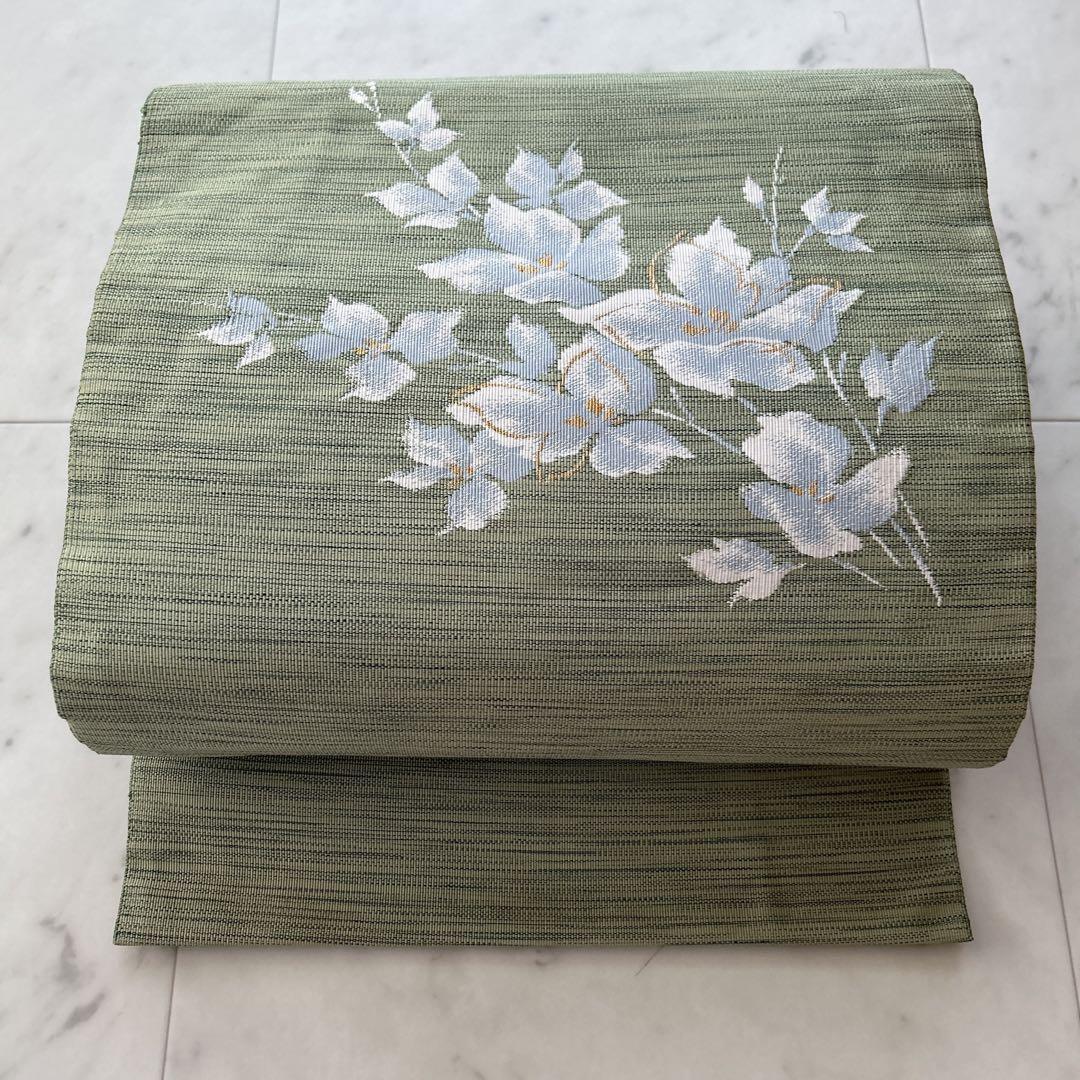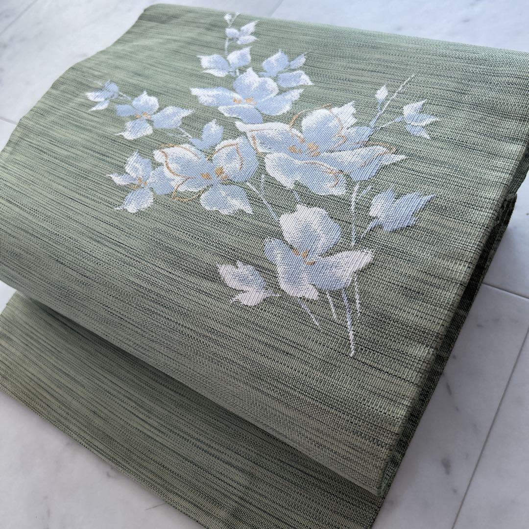落ち着いたグリーン地に白い花が優雅にあしらわれた名古屋帯です。お茶席やお出かけなどのフォーマルからカジュアルまで幅広く活躍します。控えめながらも品格のあるデザインで、季節を問わずお使いいただけます。着物初心者の方にもおすすめです。