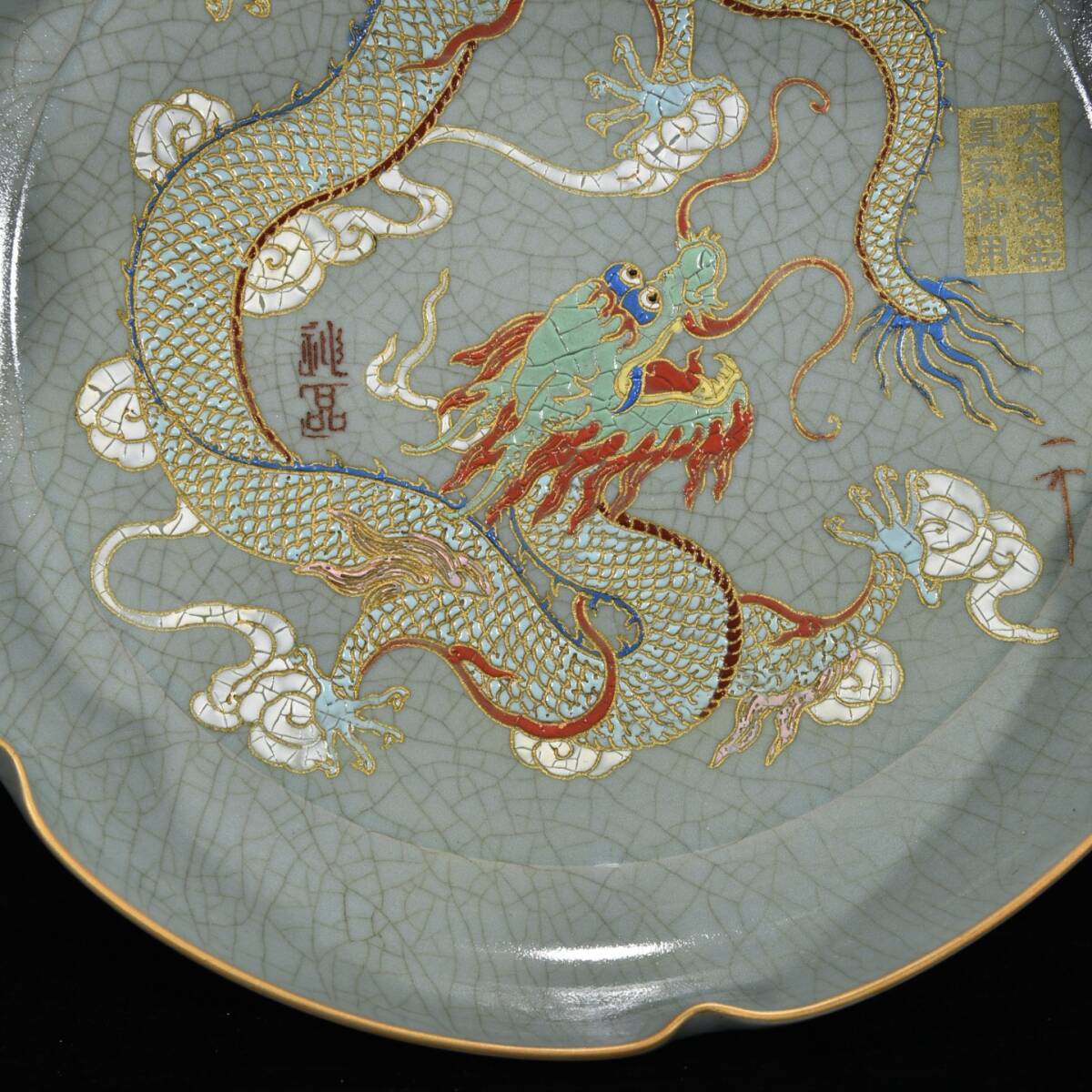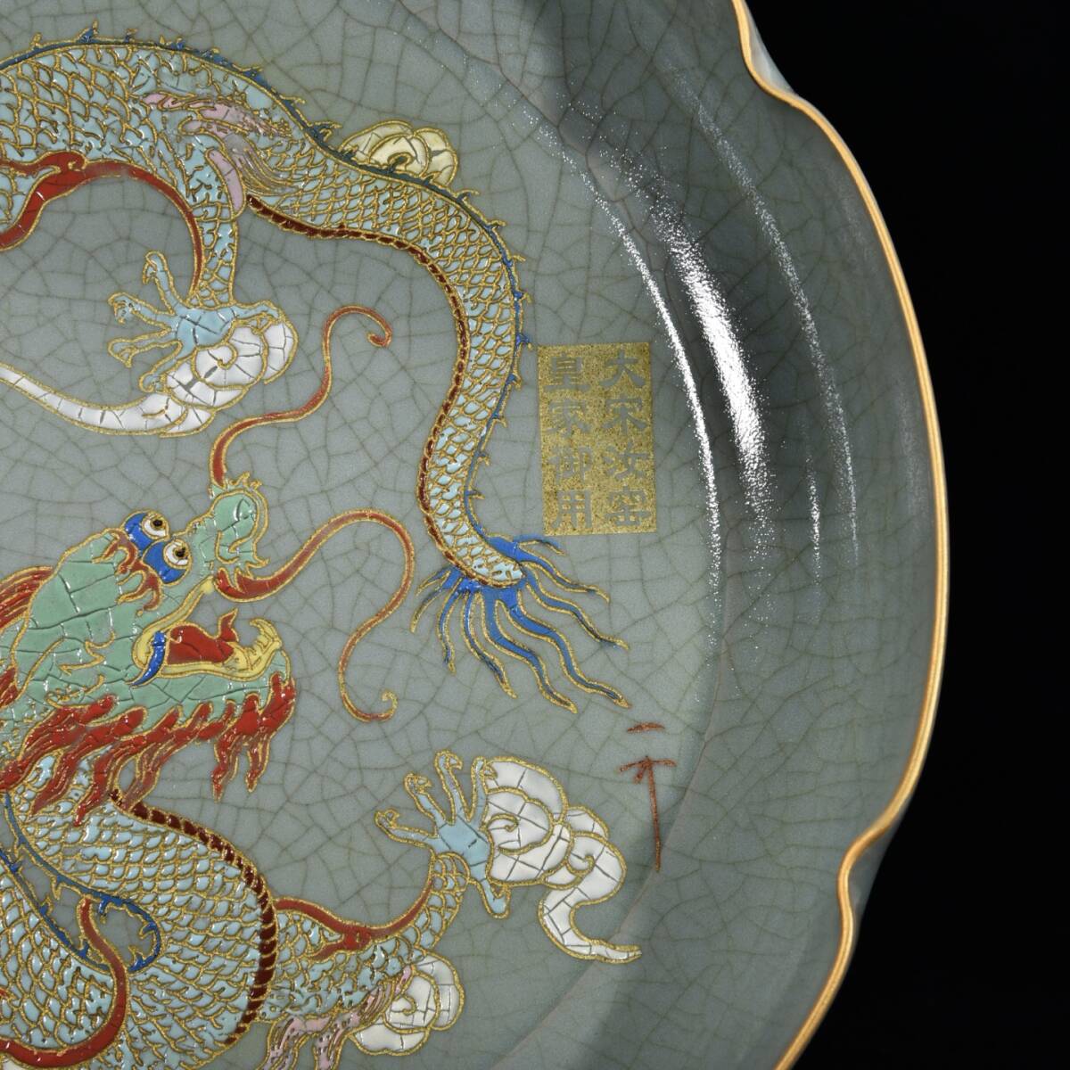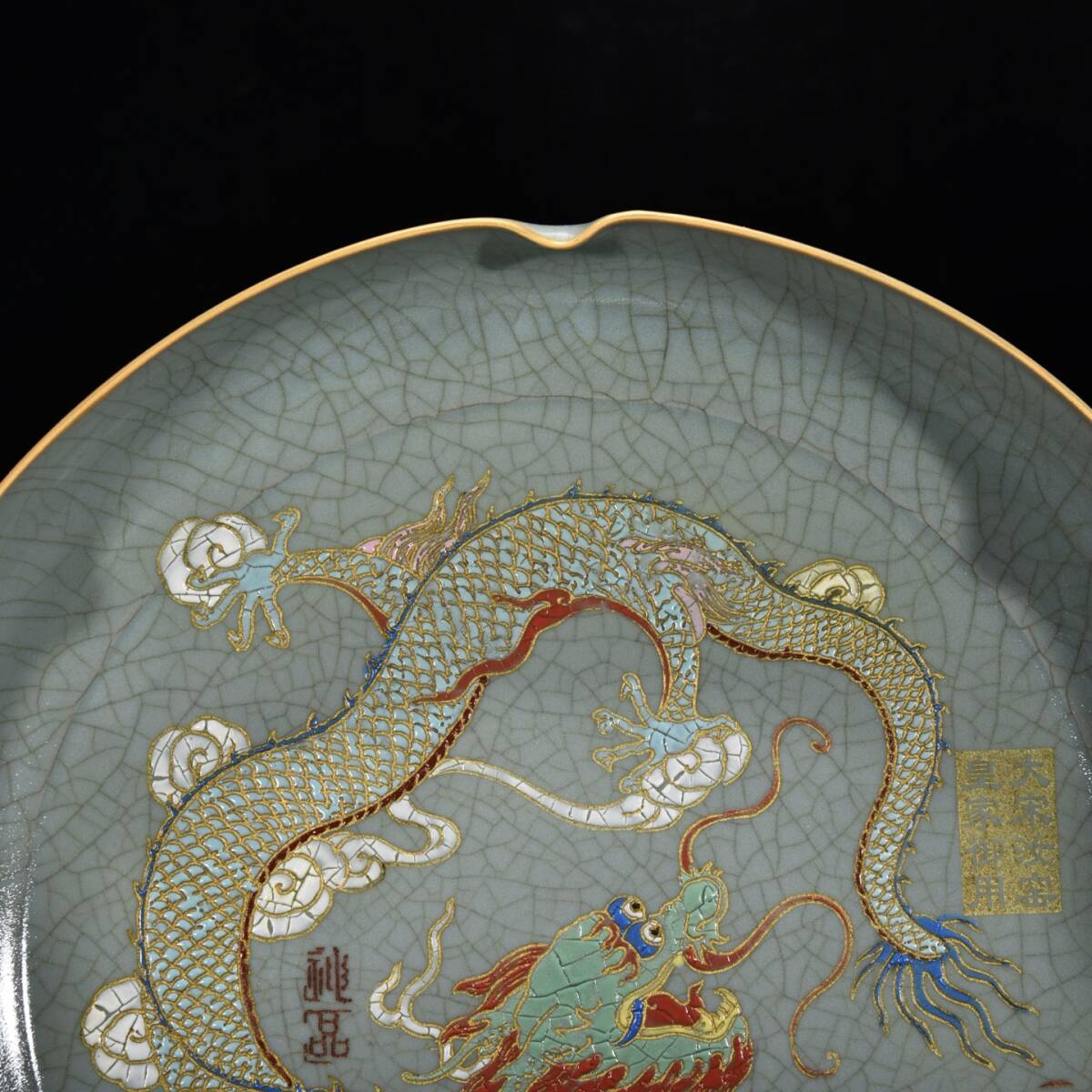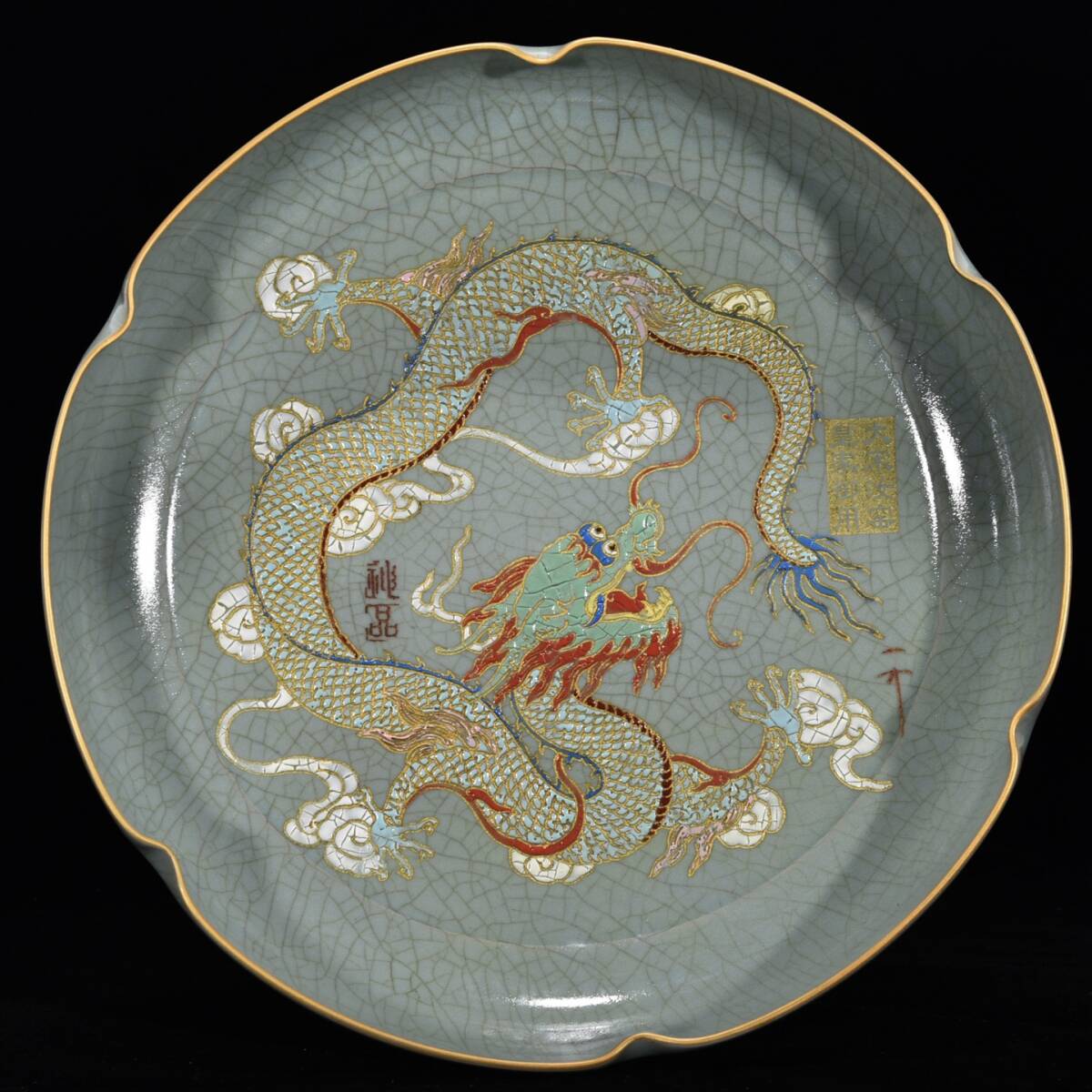唐物 宋 汝窯 絵彩龍紋 葵口皿 陶芸 古陶磁器 中国磁器 極細工 中国古玩 骨董品 古美味 D69