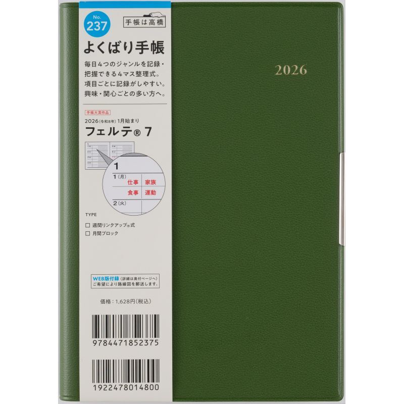 【週間予定表】〈十字に区切られたスペース〉で複数の予定・項目が管理できる高橋書店オリジナルの記入形式です。「仕事とプライベート」や「取引先ごと」など、区切り方は自由自在。「第5回手帳大賞」最優秀企画賞受賞作を商品化しました。