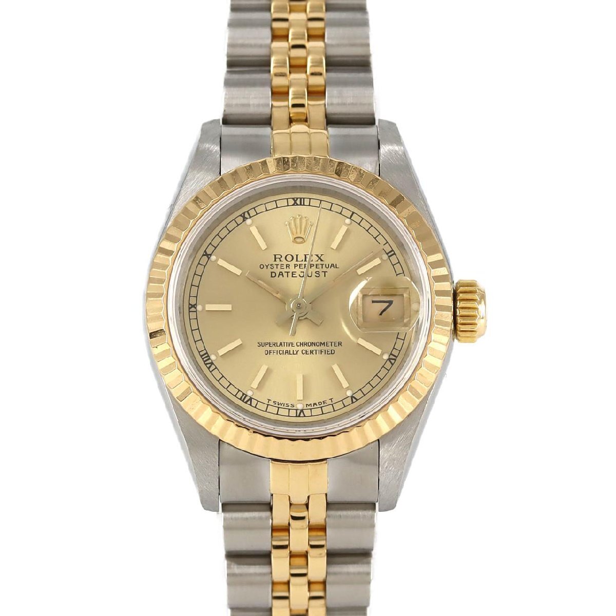 1980年代半ばから1990年代後半まで生産された、レディースデイトジャストの定番Ref.69173。ステンレスとイエローゴールドのコンビ素材、ゴールド文字盤にジュビリーブレスという、ロレックスを象徴する王道のデザインです。この世代から風防はサファイアクリスタル製となり、日常での使いやすさが向上しました。ムーブメントには日付のクイックセット機能を備えたCal.2135を搭載しており、操作性も優れています。26mmのケースサイズが腕元を上品に飾る、時代を超えて愛される不朽のモデルです。