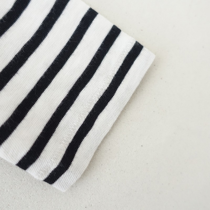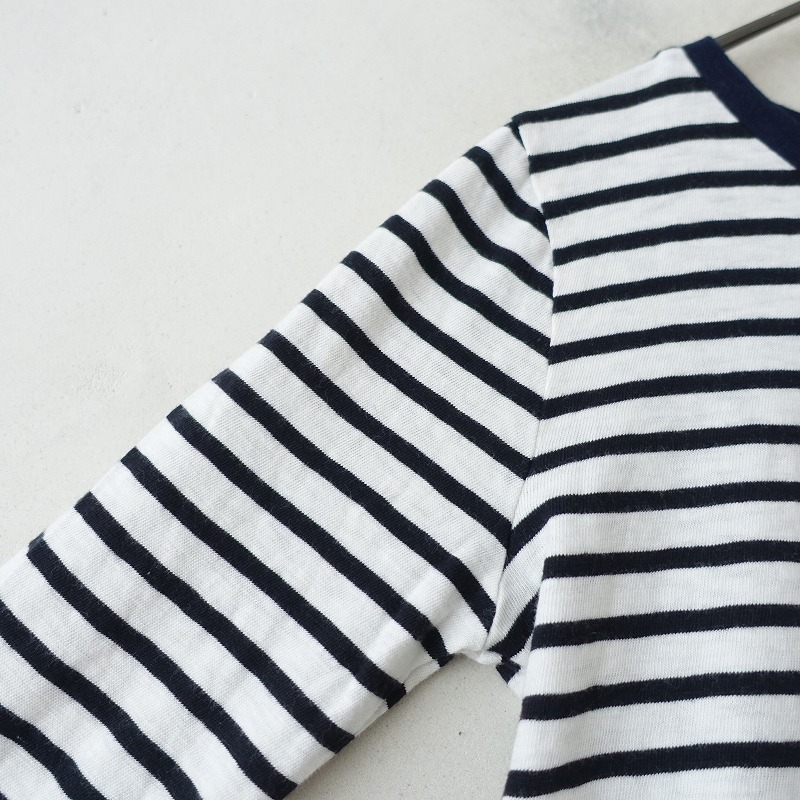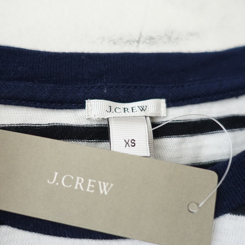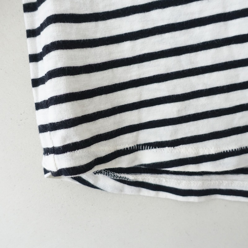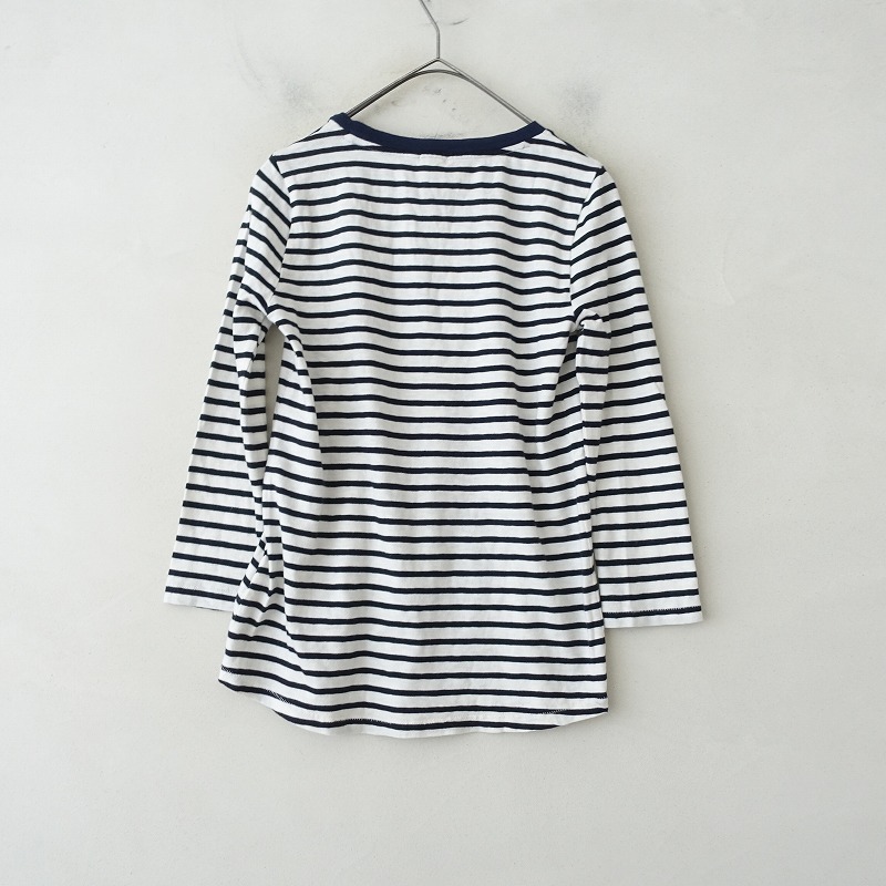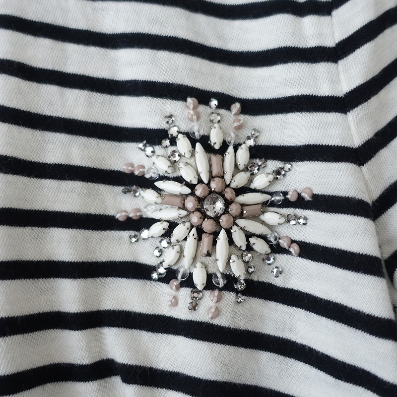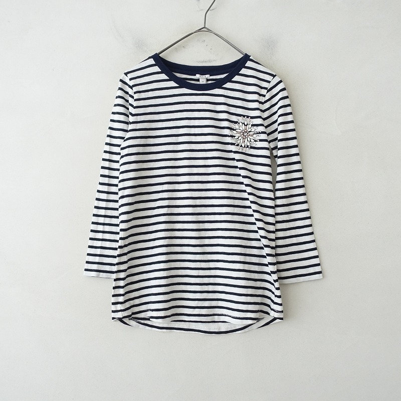 J.CREWのビジュー付きボーダープルオーバーです。カラーはブラック・オフホワイト・ネイビー、やや透け感のあるカットソー素材で、左胸にビジューがあしらわれております。 |