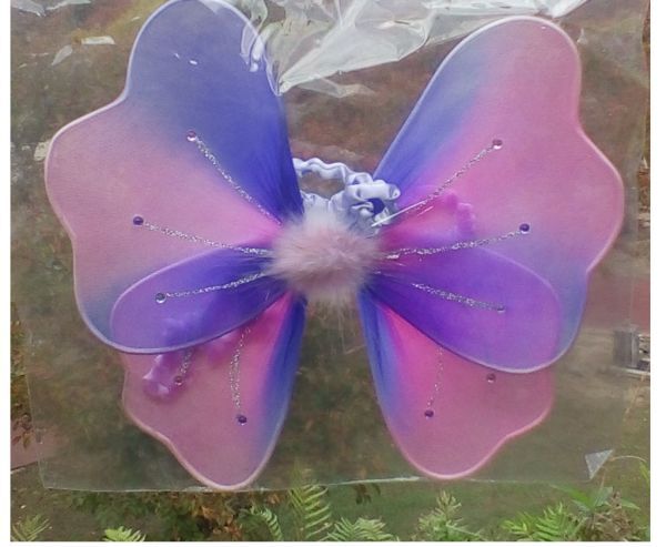 ピンクと紫のストライプにシルバーのライン、プラスチック製のラインストーンが付いた羽です。