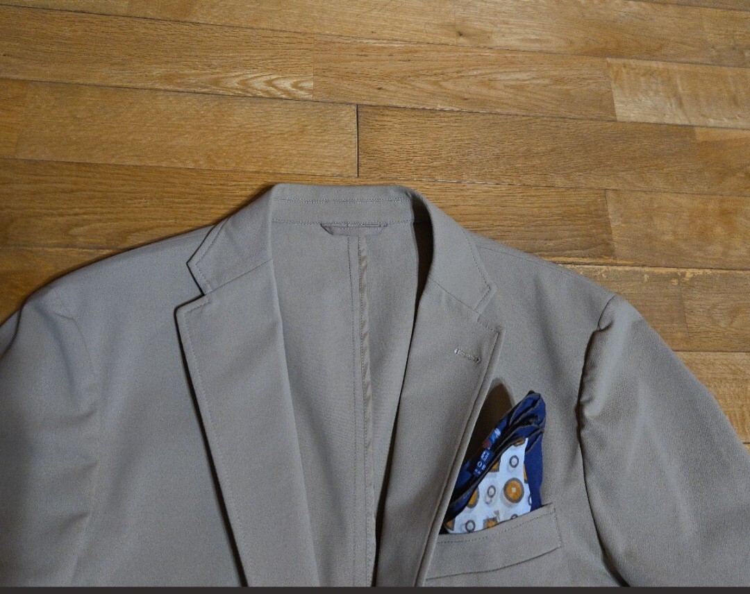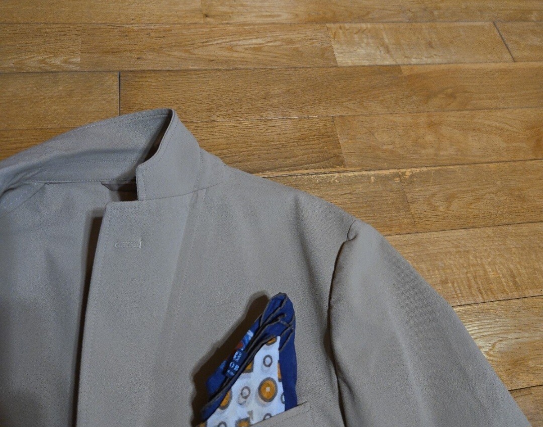 生地は柔かな快適な着心地が良い、滑らかで爽やかなベージュのストレッチジャージーが特徴の素材感。滑らかなストレッチの効いた通年素材『ストレスフリー 機能性ストレッチジャージー』生地を使用したトラッド感もあるジャケパン代わりにもなりますベージュジャケット。細身のスタイリッシュなデザインながらも、軽い着心地で、ラフにカジュアルスタイルにも、カチッとしたオンスタイルにも使用して頂けます。