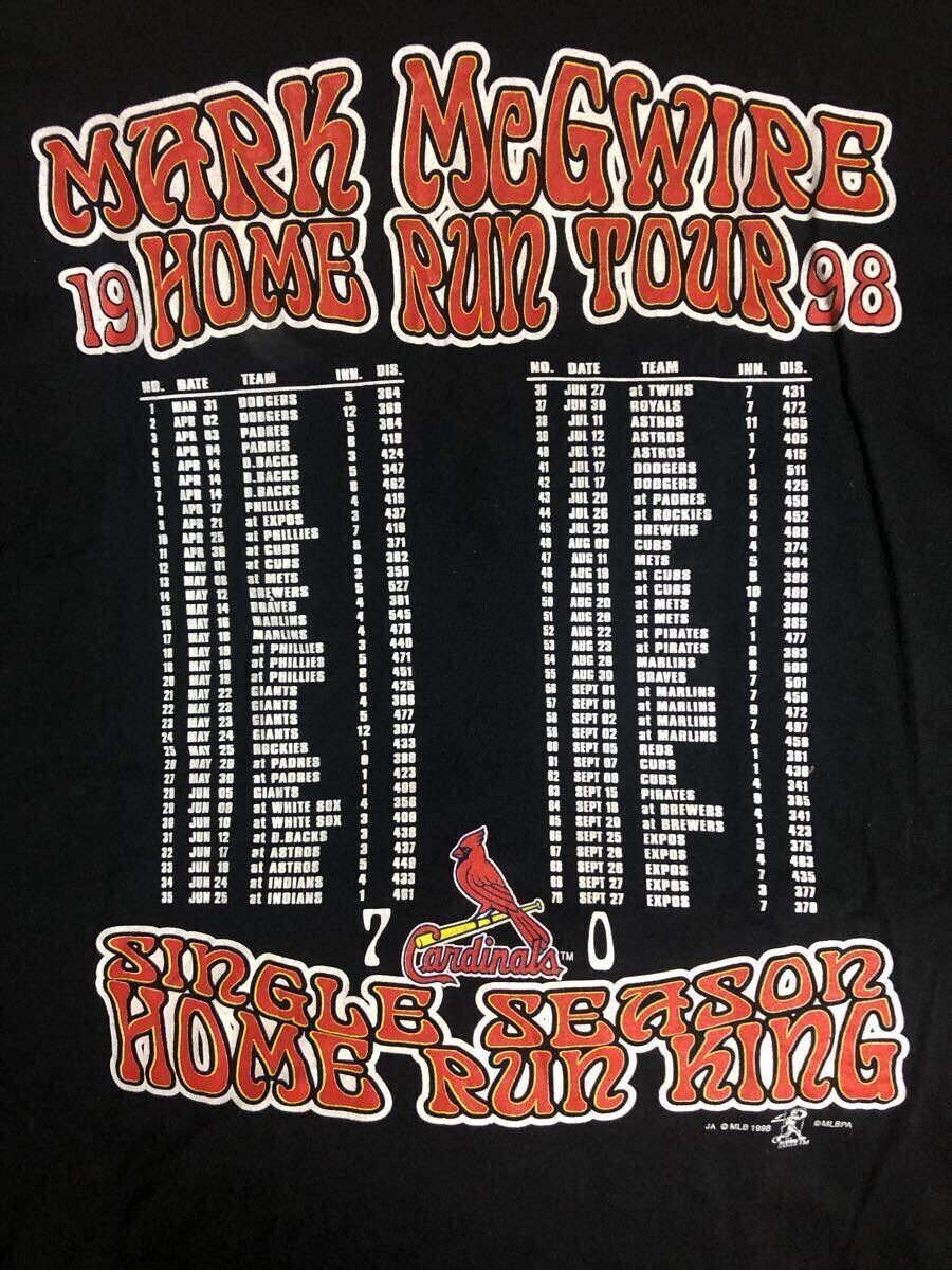 98年シーズン70号ホームランを打ったマーク マグワイア選手の記念両面プリントTシャツとなります。