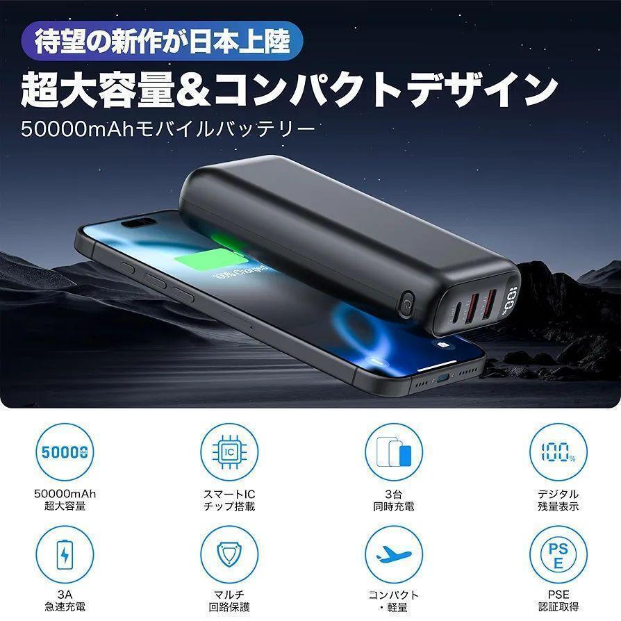 【2025新登場】モバイルバッテリー 大容量 50000mAh 22.5W/PD20W 3A急速充電対応 iPhone16充電器 Type-C入出力 3台同時充電可能 携帯充電器 LCD残量表示 iPhone/iPad/Android全機種対応 PSE認証済 防災グッズ 旅行/出張/停電/地震【非常時の備え】