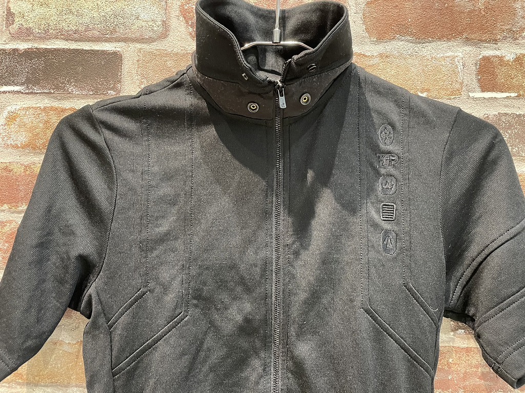 襟はスナップボタンで留める折りたたみ式で、裾はサイズ調整ができ、より体型に合わせたフィッッティングができることも特徴です。