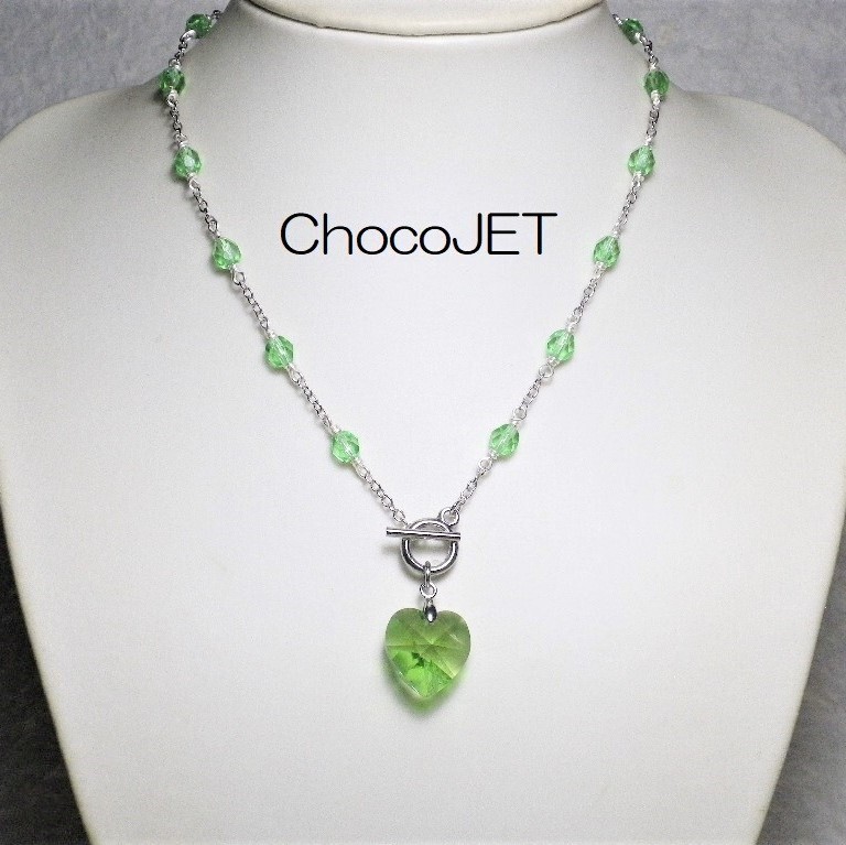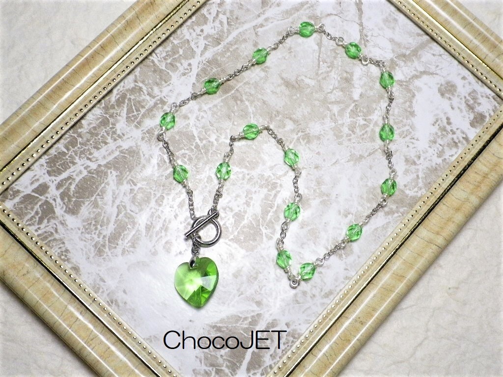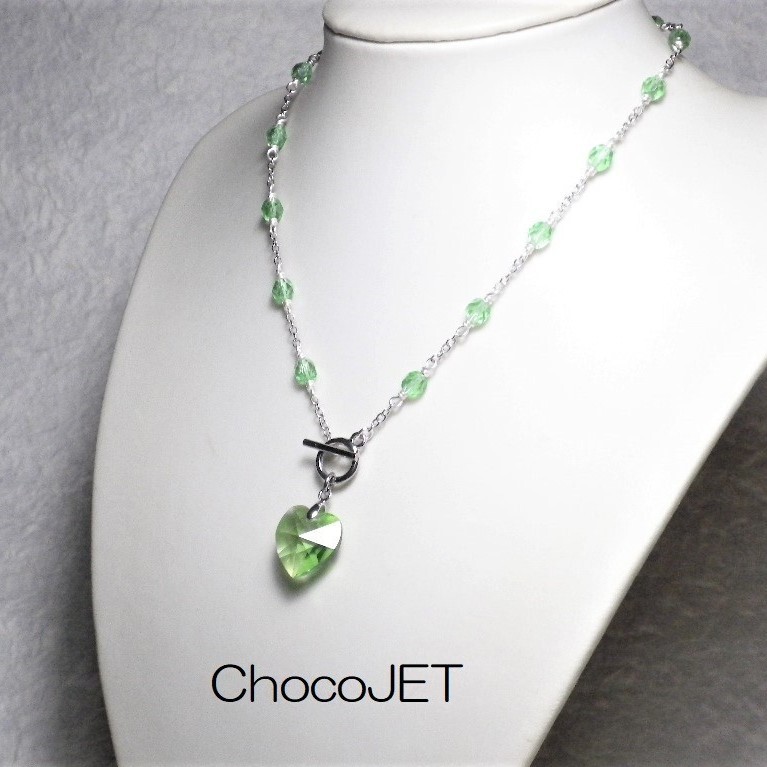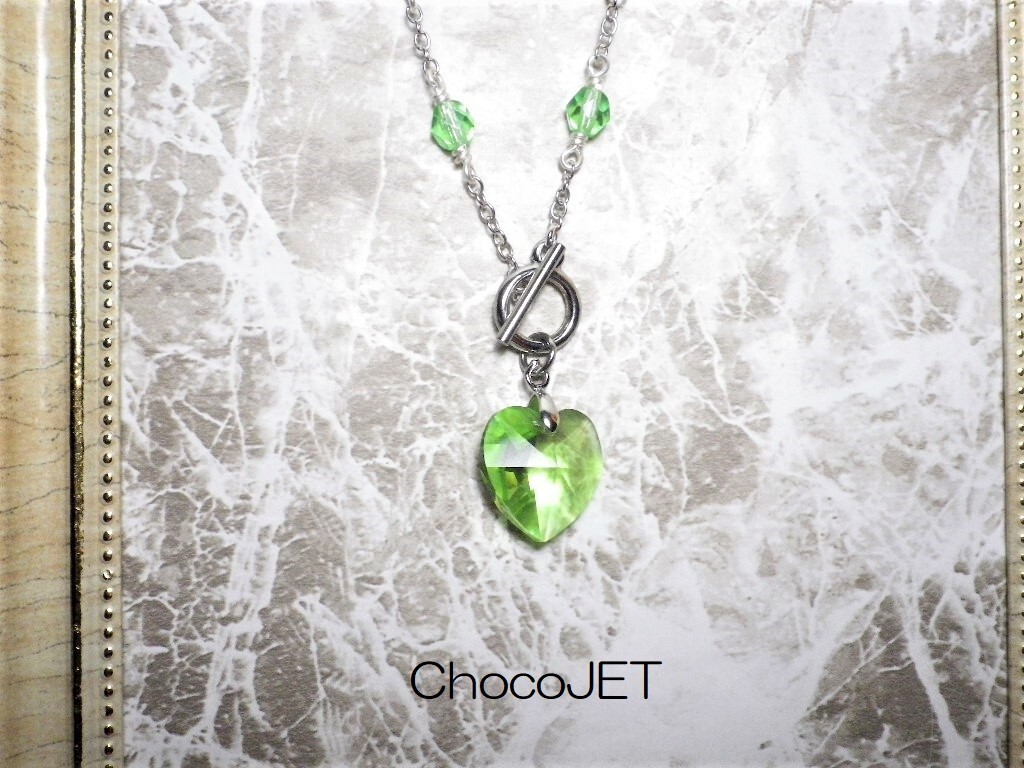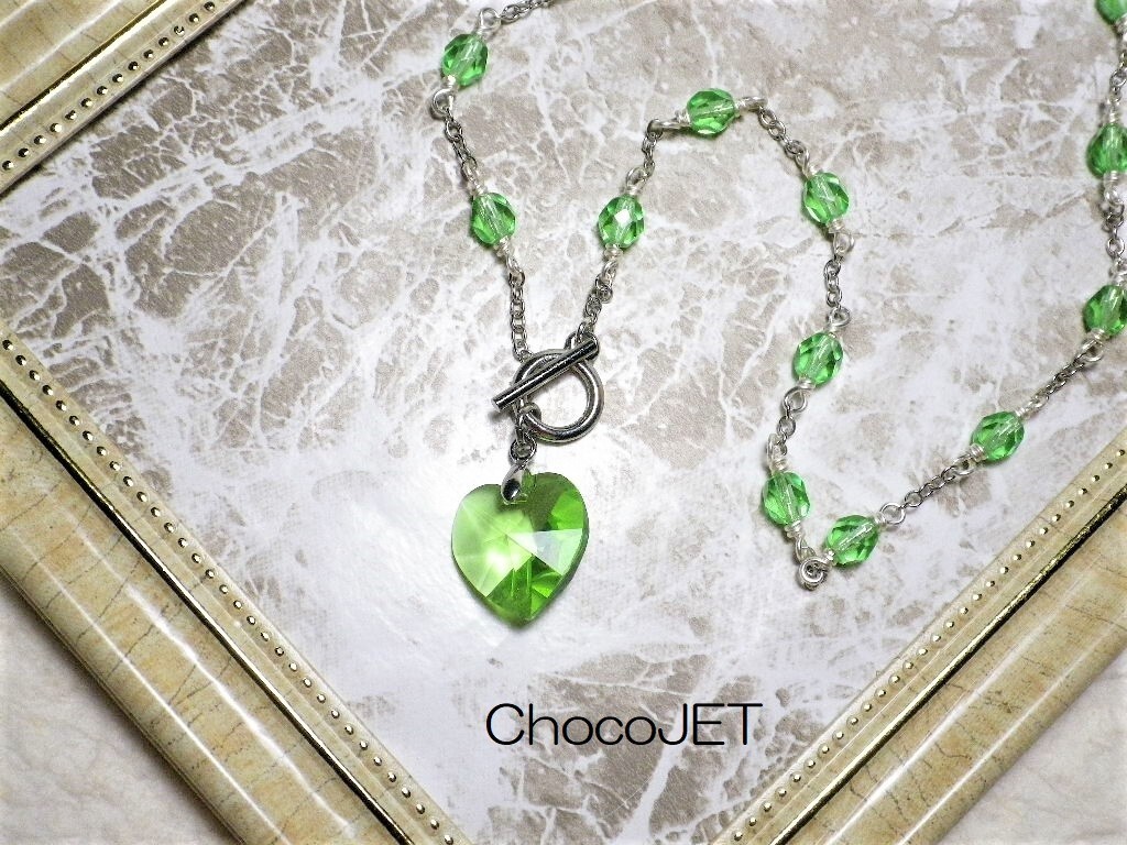 クリスタル・スワロフスキー6202ハートとチェコビーズとチェーンで制作したキラキラ輝く、マンテル留めハートネックレスです。