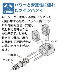 ●安定性、耐久性、効率に優れたツインハンマの採用によりインチクラスに匹敵する最大1600N・mのハイパワー。