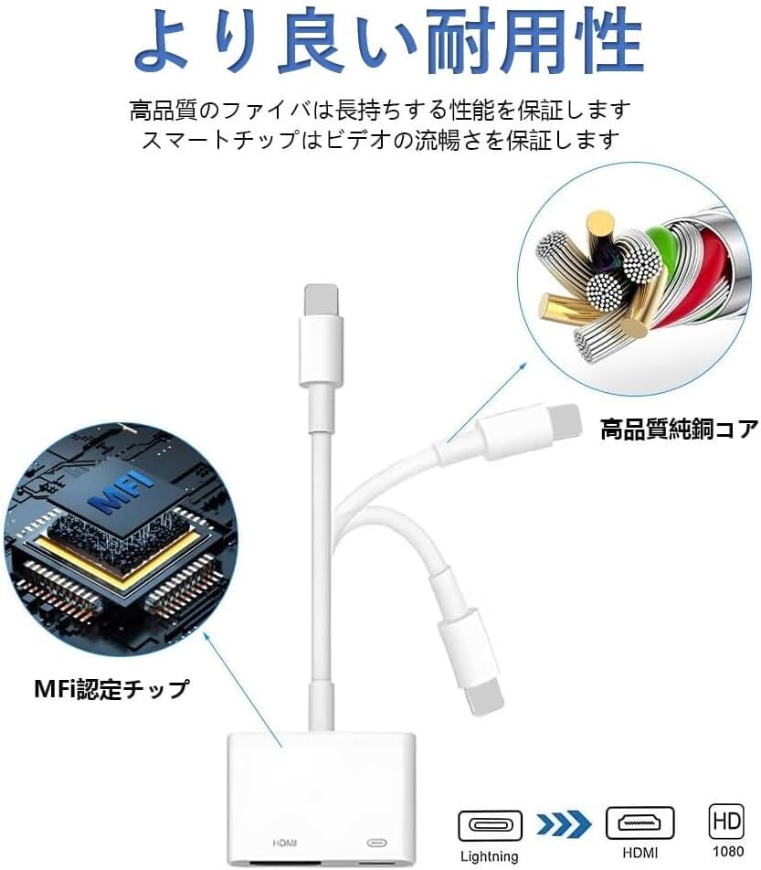 • 【1080P HD & 遅延なし】:iphone hdmi変換ケーブル最新のチップを使用して、鮮明な画質を確保できます。 1080P高解像度ビデオを遅滞なく端末送信することで、究極の視覚体験を提供します。 MFi正規認証チップを搭載し、データ転送全体が格段に高速化され、超低遅延での映像出力を実現します。大画面でもストレスなくコンテンツを楽しむことができます。テレビへの出力やPC画面への出力時でも遅延はありません。