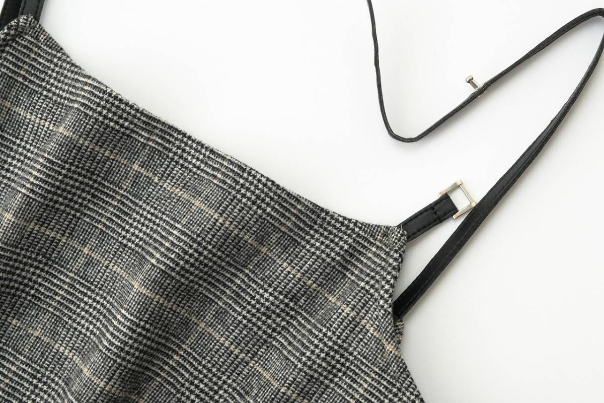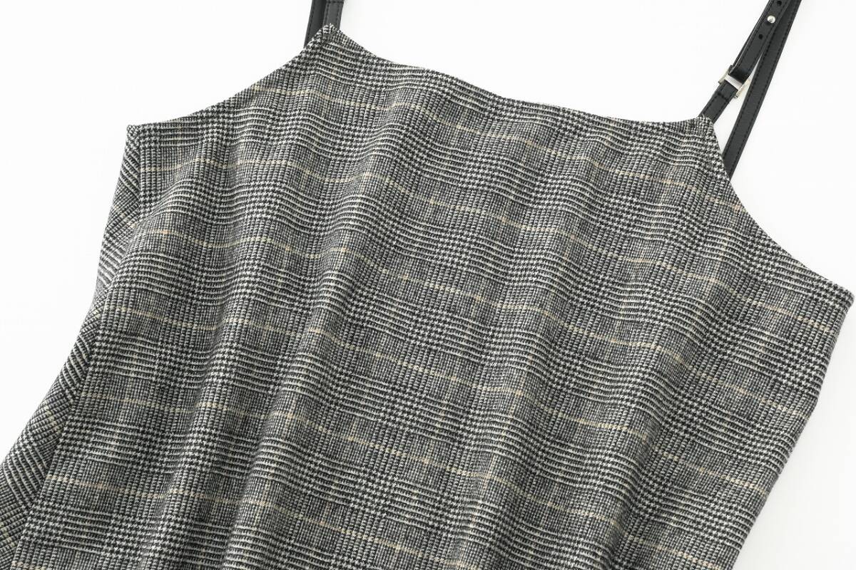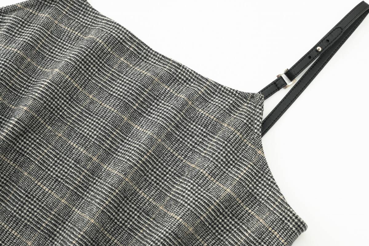 レザーの肩ひもがクラシカルな雰囲気を添え、シルエット全体を引き締めています。