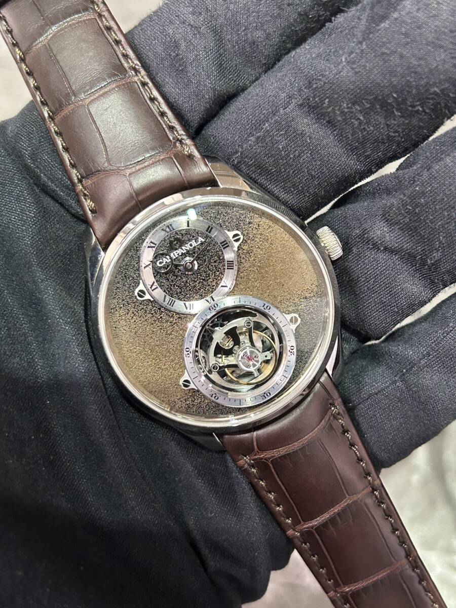 伝統工芸士が手がけた文字板の漆塗りを手がけた文字盤でございます。下記HPからの引用ですが、物質の根源である地球を日本伝統の漆塗りで表現。乾漆粉で荒らした生地に金を蒔いて研ぎ出し、荒々しい黒と金の肌が融合した独特の質感を生みだしましたとの事。工芸品でございます。フライングトゥールビヨンを搭載し10㎜のケース厚におさえられている技術の詰まった一品でございます。