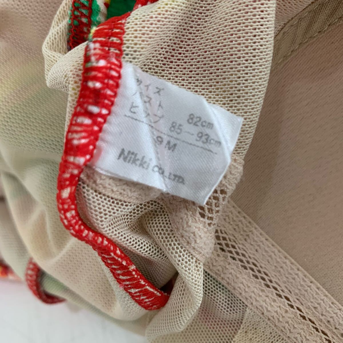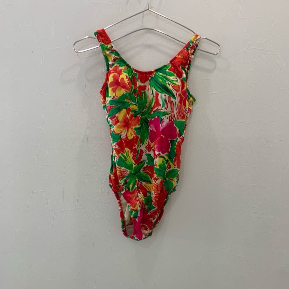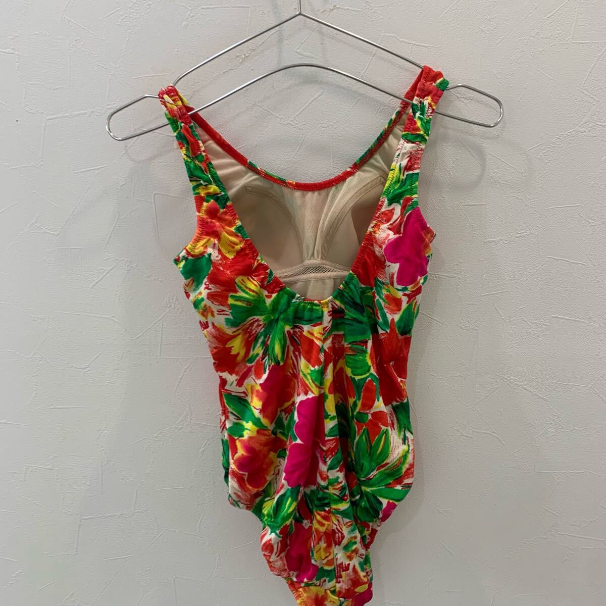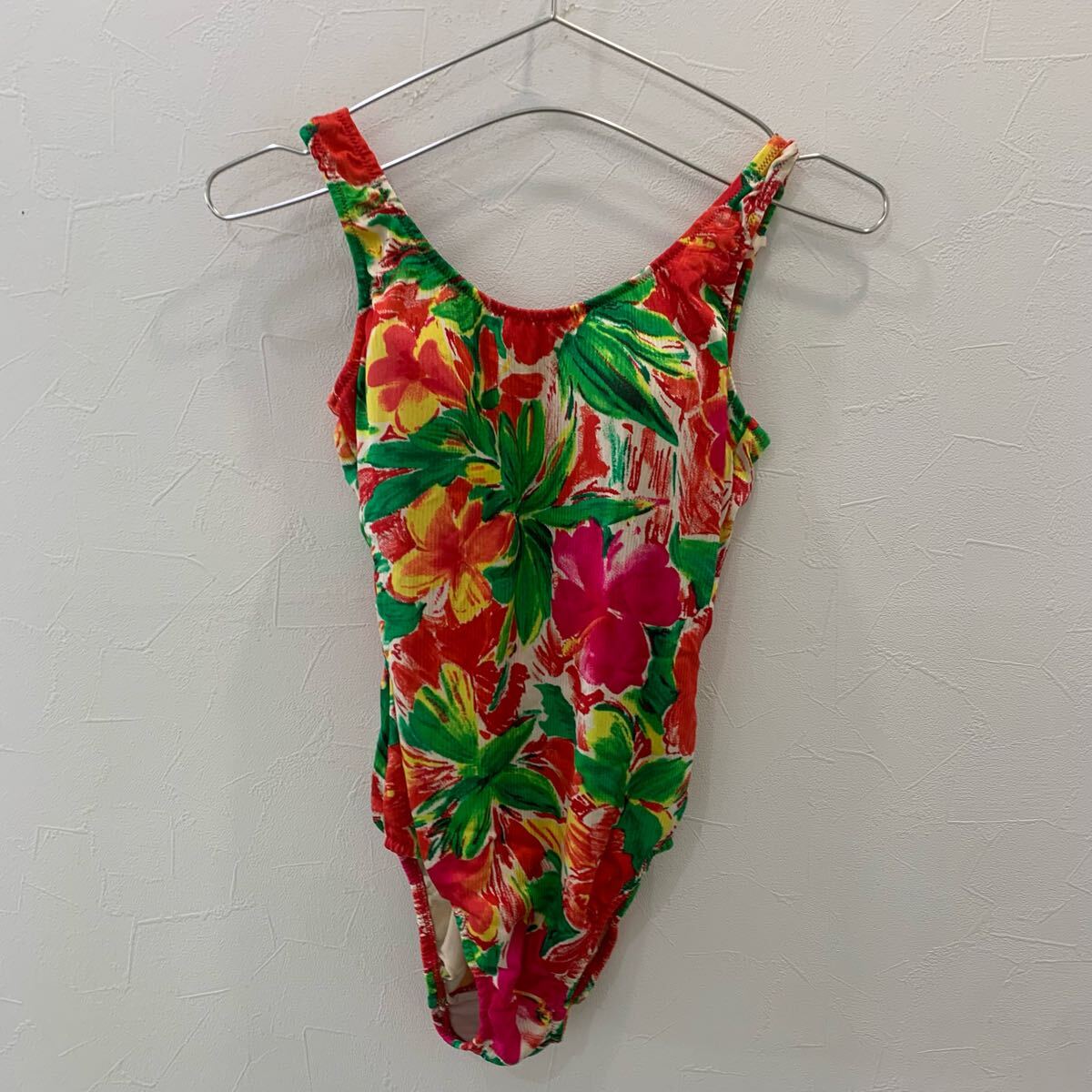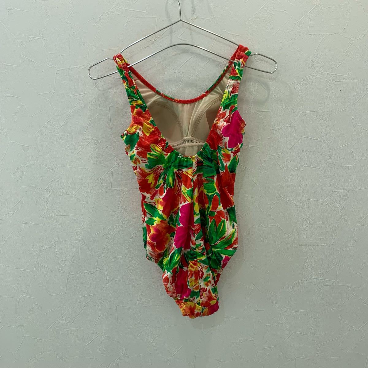 J629 スイムウェア レトロ 花柄 グリーン 赤 クリーニング済み レディース M