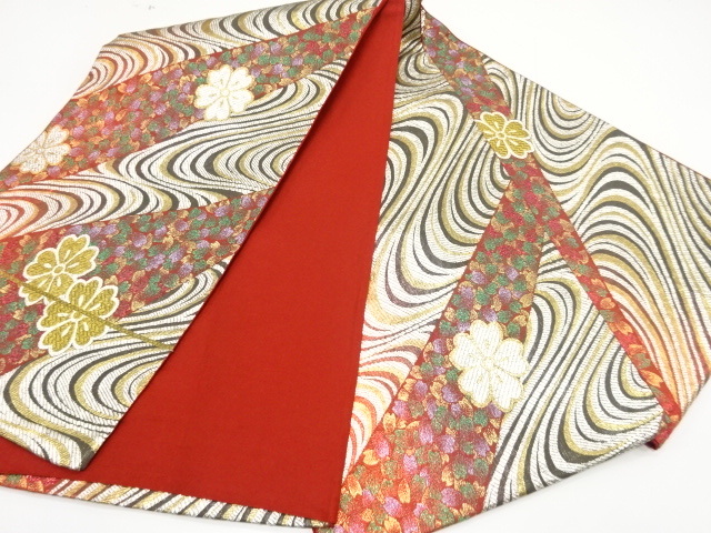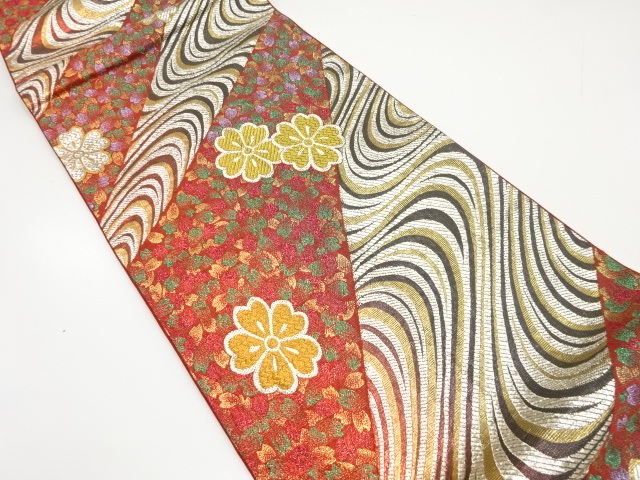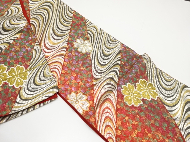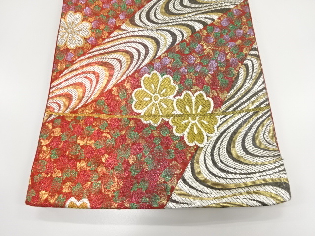美品 流水に桜模様織り出し 全通 振袖用 袋帯 (HBH1K-045)