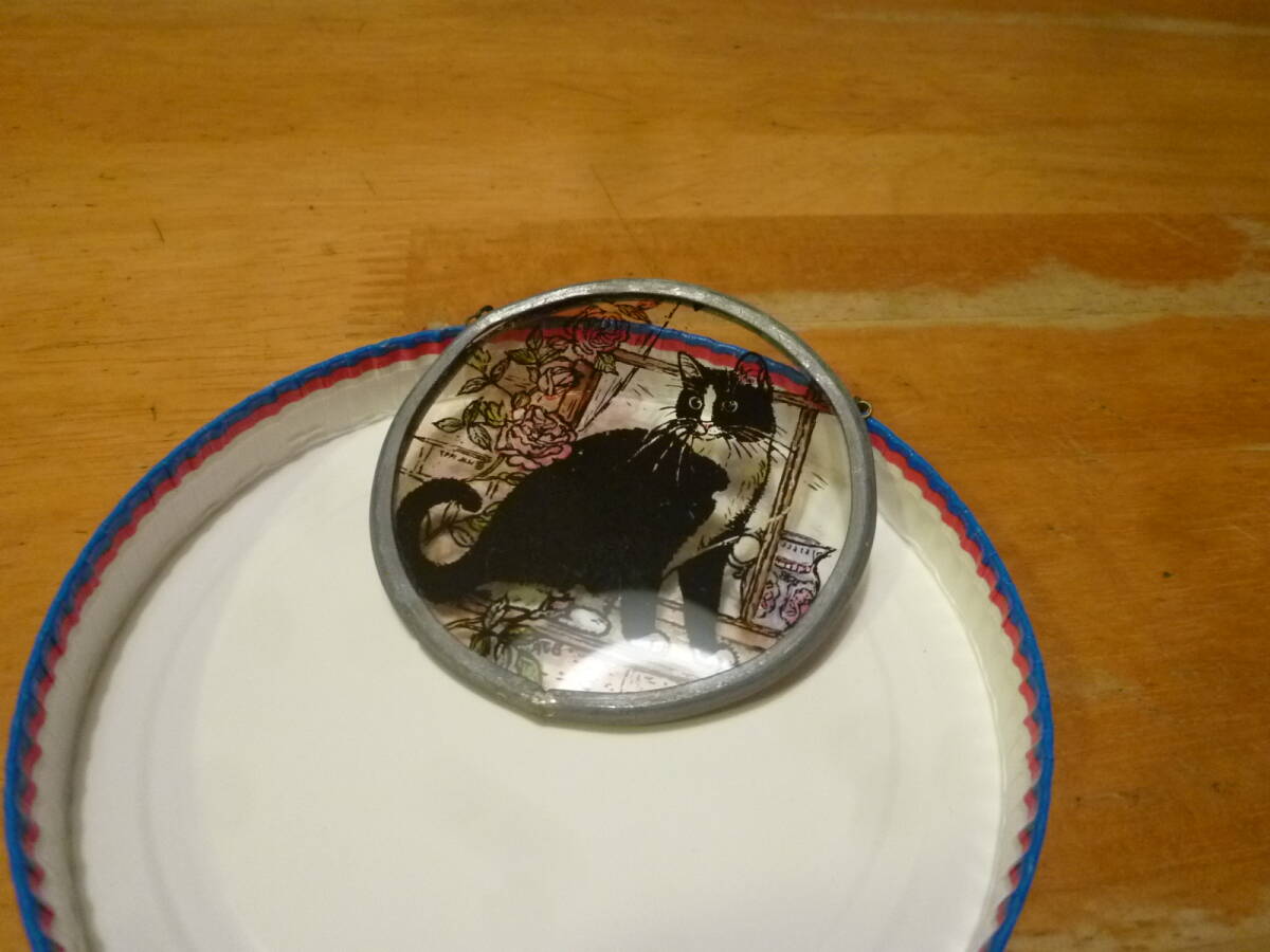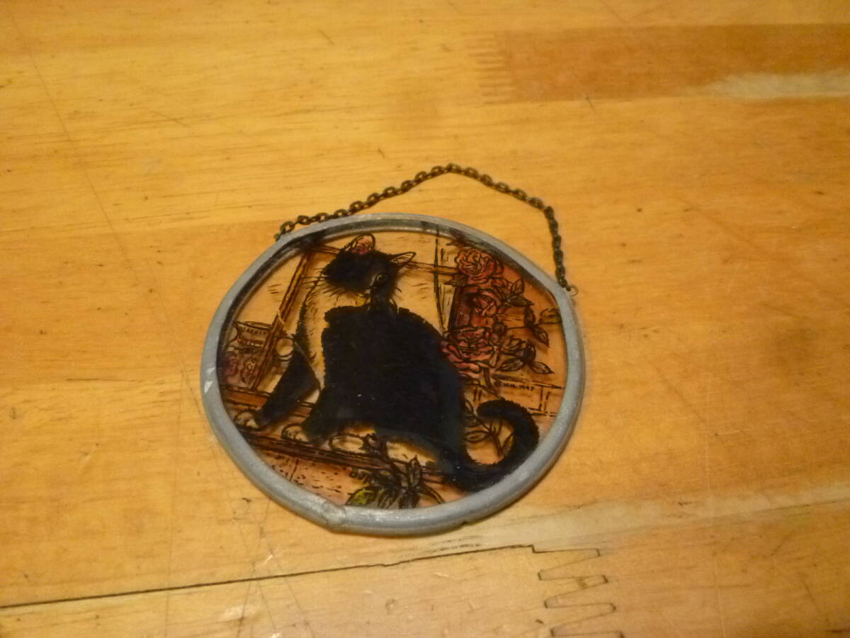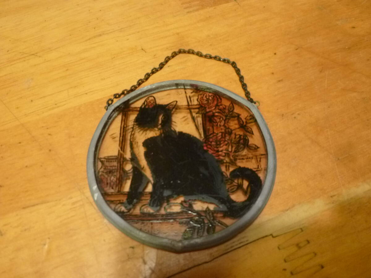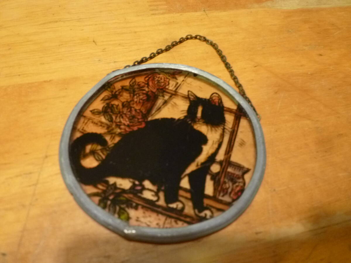 こちらは金属製で回りを処理されたガラス板に、窓辺でバラの花と白黒ブチ猫がデザインされた吊り下げ飾りの様で、細かなヒゲや表情と薄いバラのピンクと白黒猫のコントラストもオシャレです。