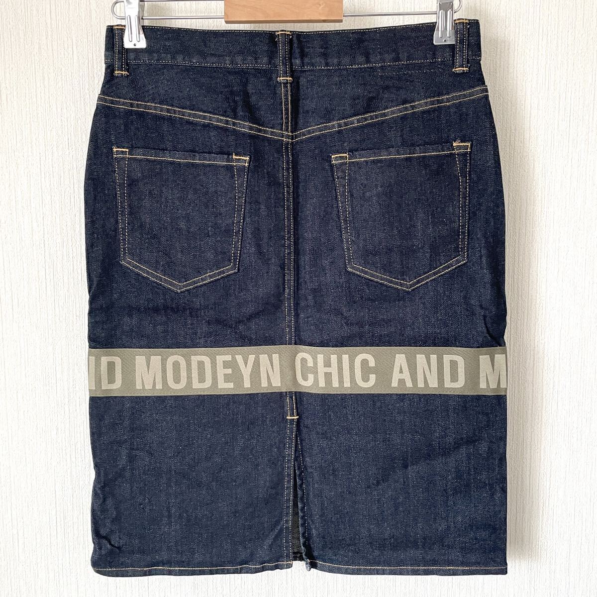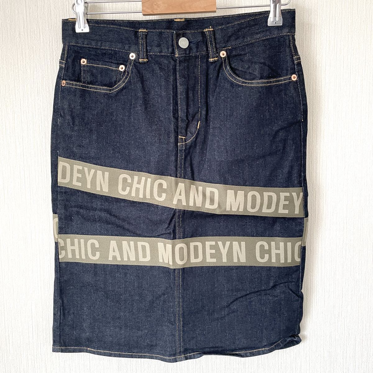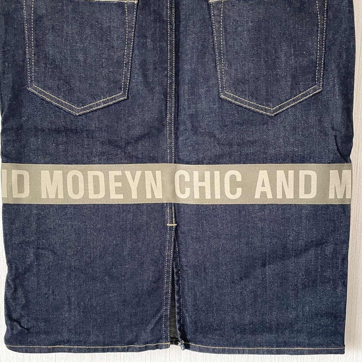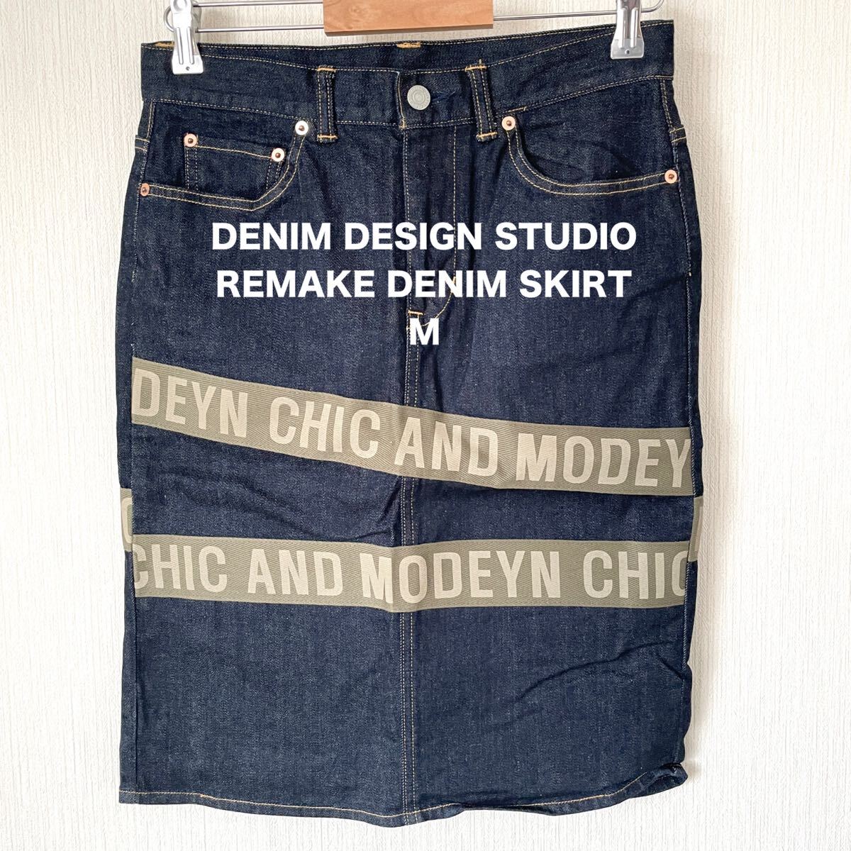 膝下丈くらいのデニムスカートに、英字メッセージテープを前と後ろに縫い付けてみました。