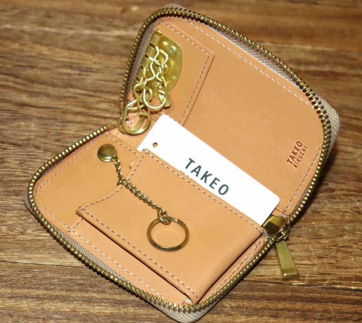 ・ブランドロゴの型押しと太めのステッチ・クラシックな真鍮色のファスナー・取り外し可能なキーチェーンがあります