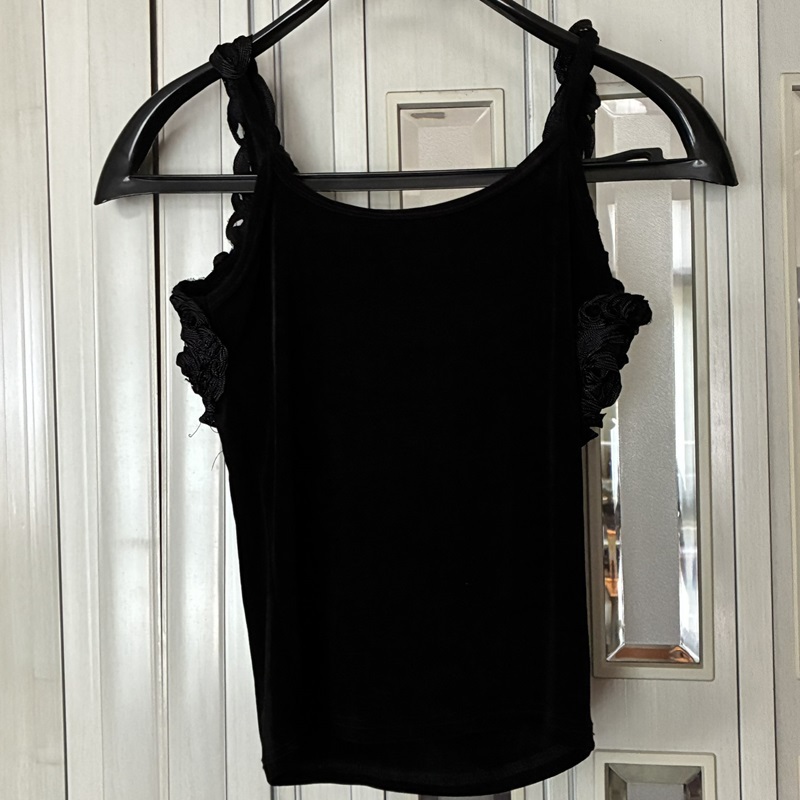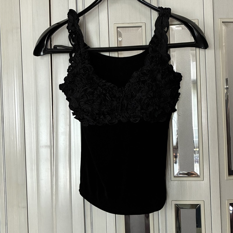 フラワーレース付きのタイトフィットブラックキャミソール。
