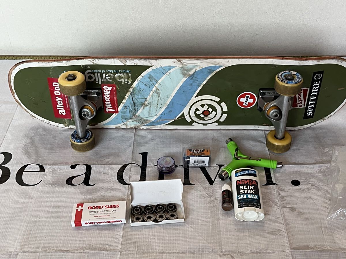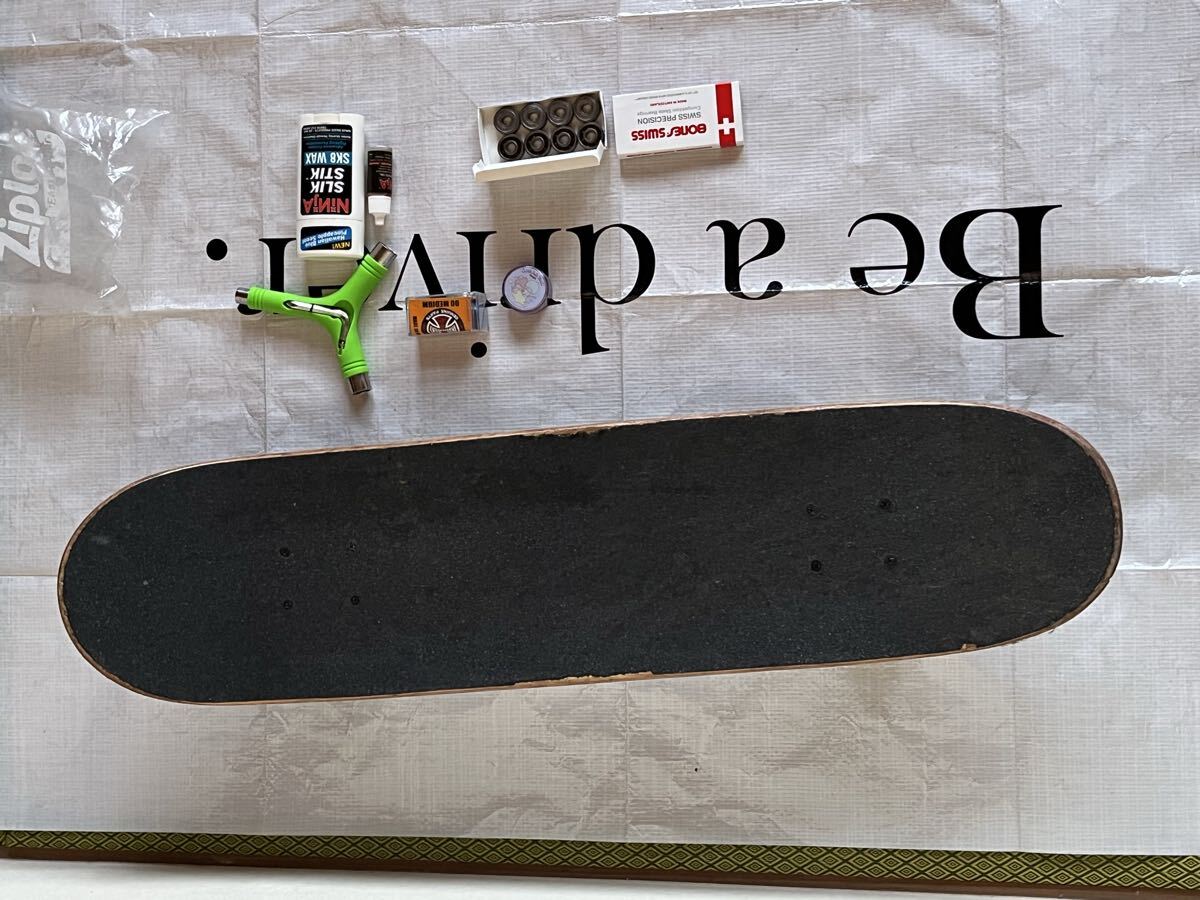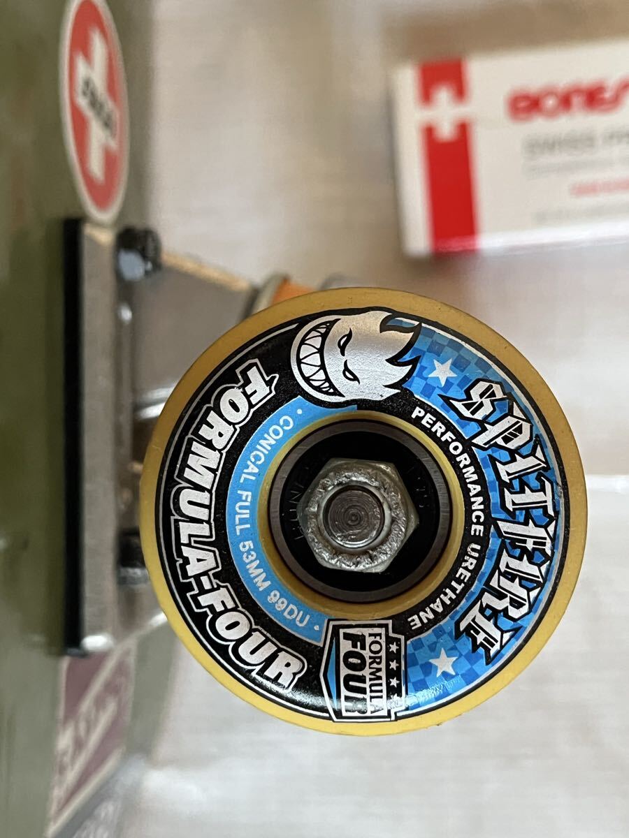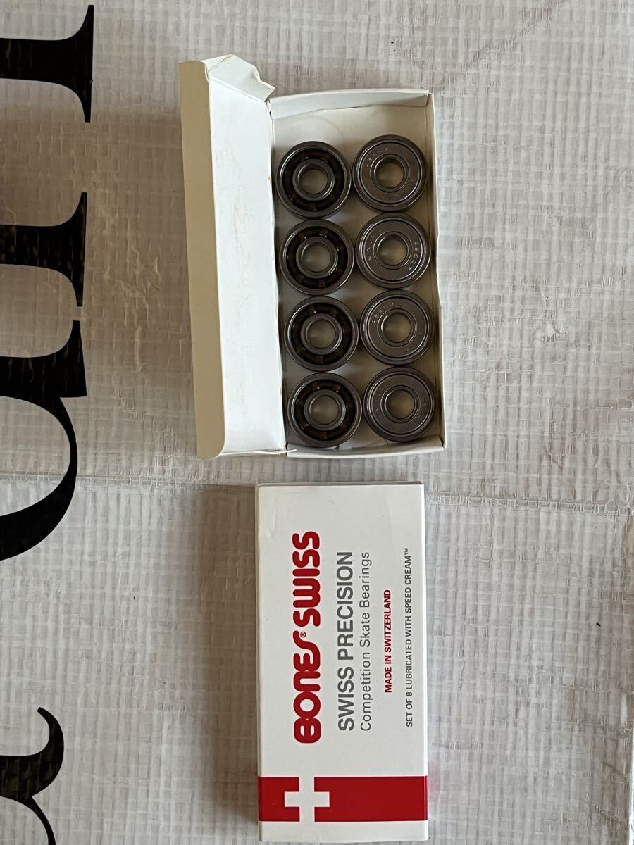昔使ってたセットのベアリングとウィールを新品に変えて復帰してみようとしましたが無理だったので出品します スイスボーンの箱に入ってるのは昔使ってたニンジャの7番です。写真のものが全てです。ベアリングとウィールは変えて一時間も使ってません。