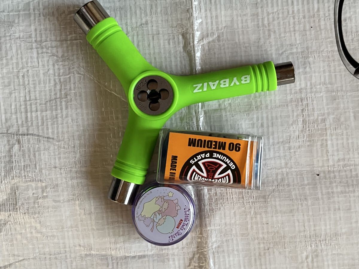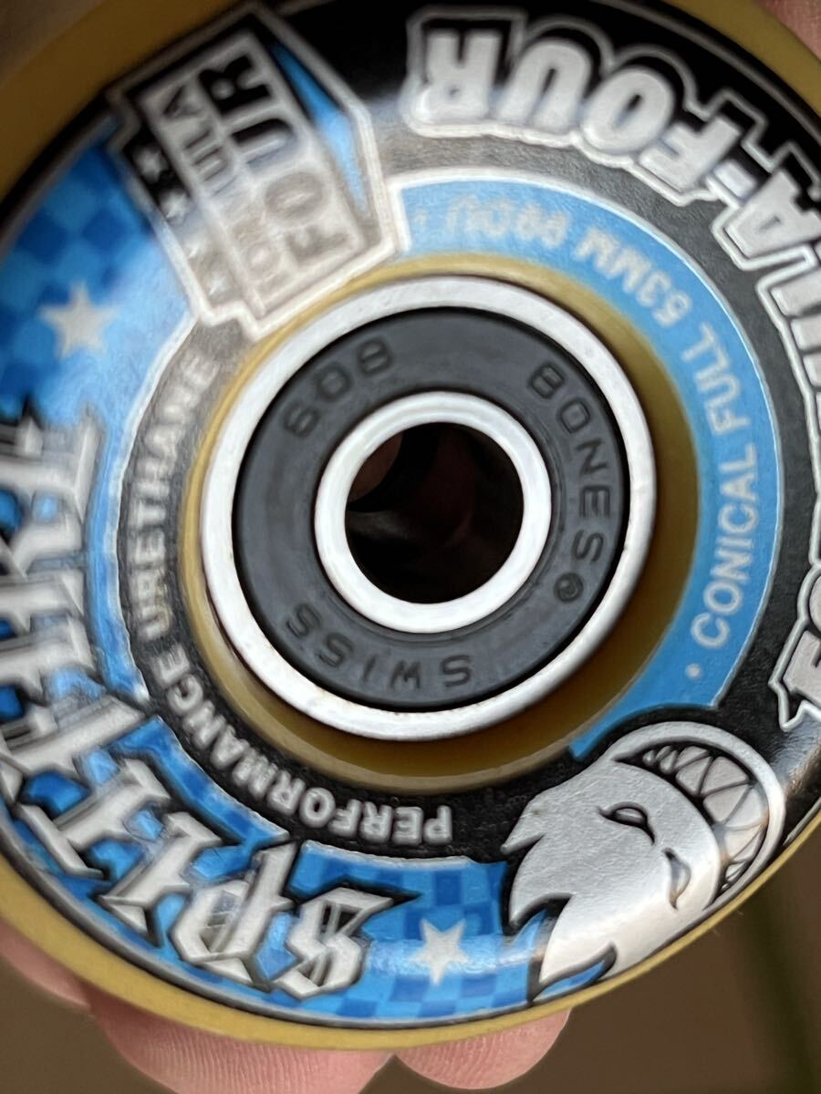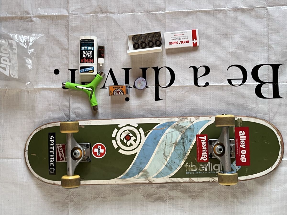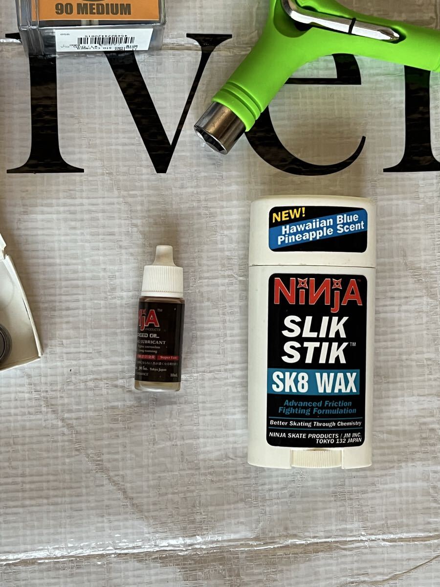 昔使ってたセットのベアリングとウィールを新品に変えて復帰してみようとしましたが無理だったので出品します スイスボーンの箱に入ってるのは昔使ってたニンジャの7番です。写真のものが全てです。ベアリングとウィールは変えて一時間も使ってません。