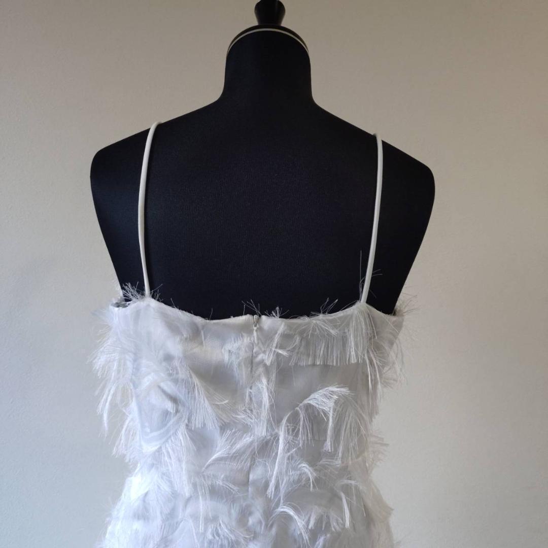 バックジップでシルエットも美しく、なびくフェザーが雰囲気たっぷりの