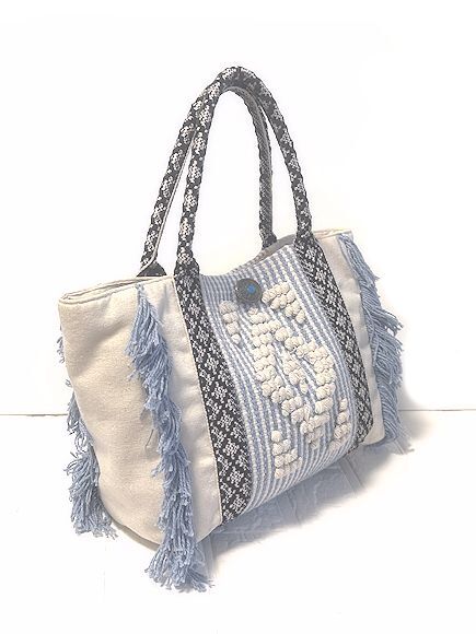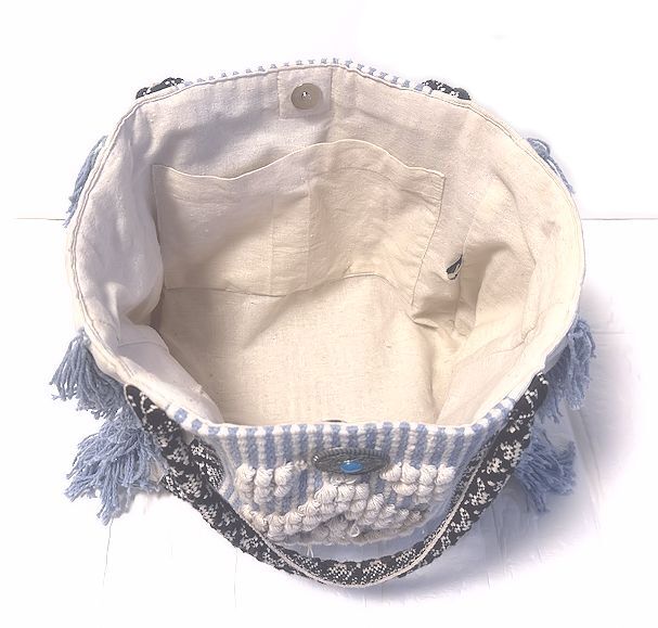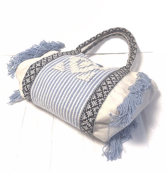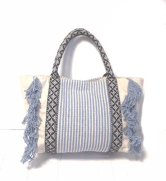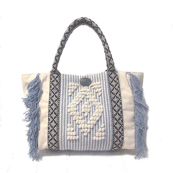 値下★Kahiko カヒコ・チャイハネ★コンチョ付き・フリンジ・コットン・トート・バッグ・サックスブルー×オフホワイト×ブラック★美品