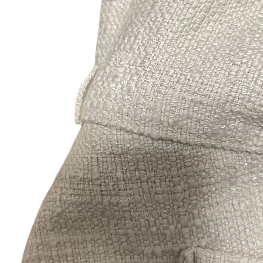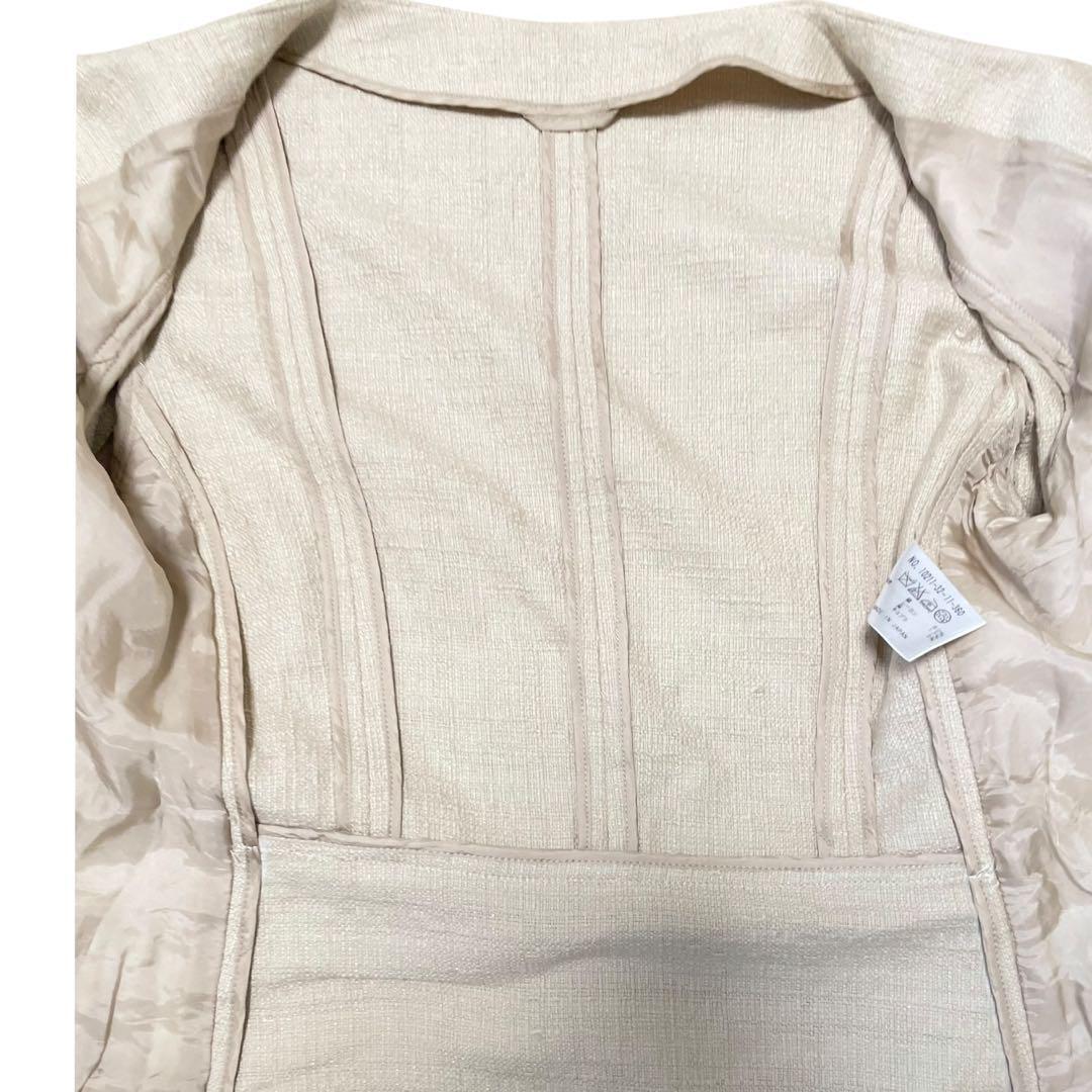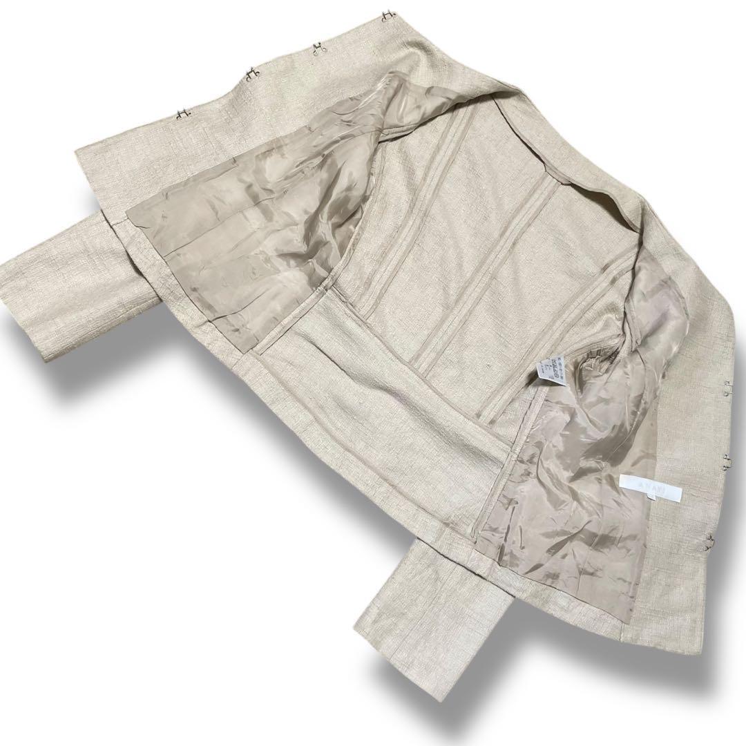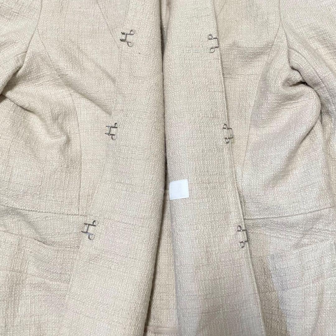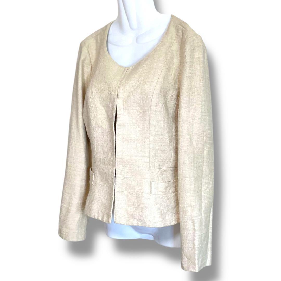 ベージュのノーカラージャケット、シンプルで洗練されたデザイン。