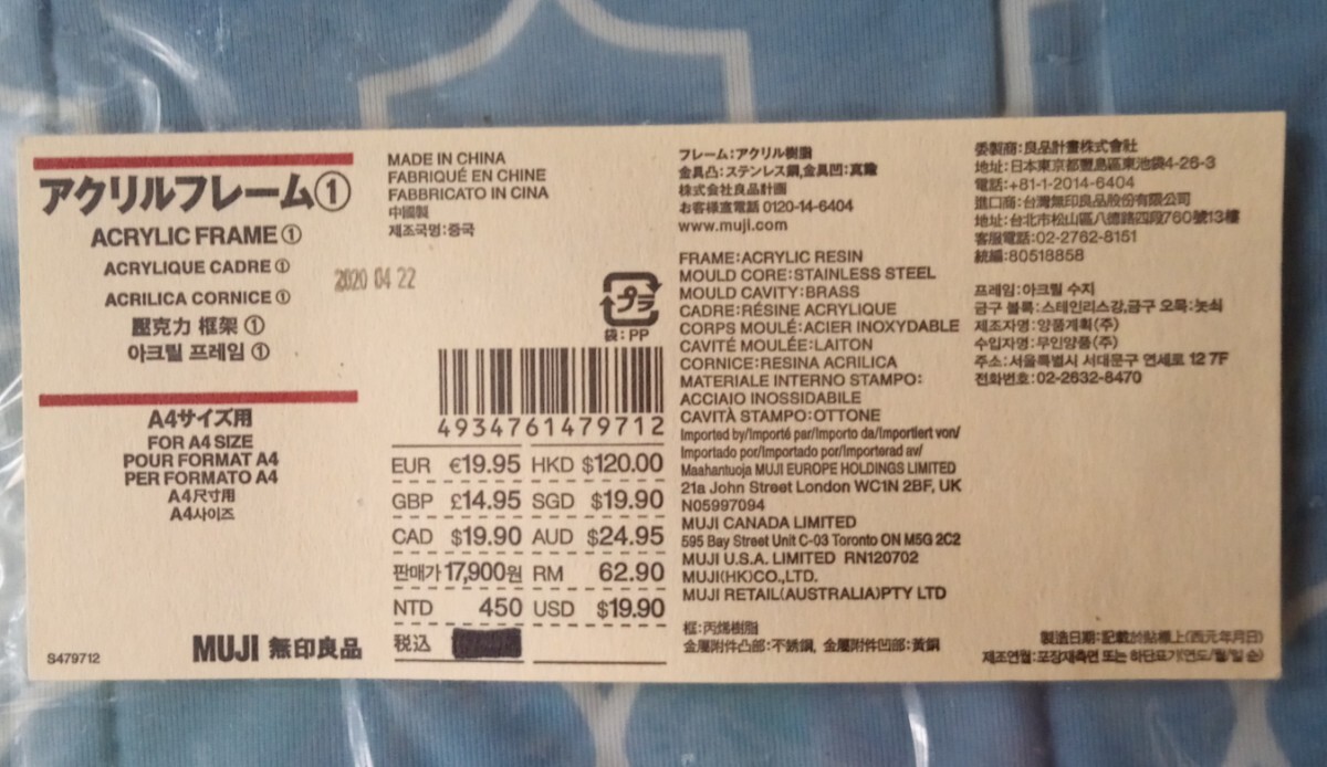 無印良品【アクリルフレーム・A4サイズ用】フレーム外寸:350×260㎜★未使用・未開封